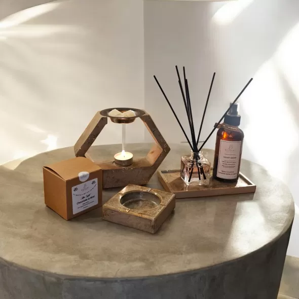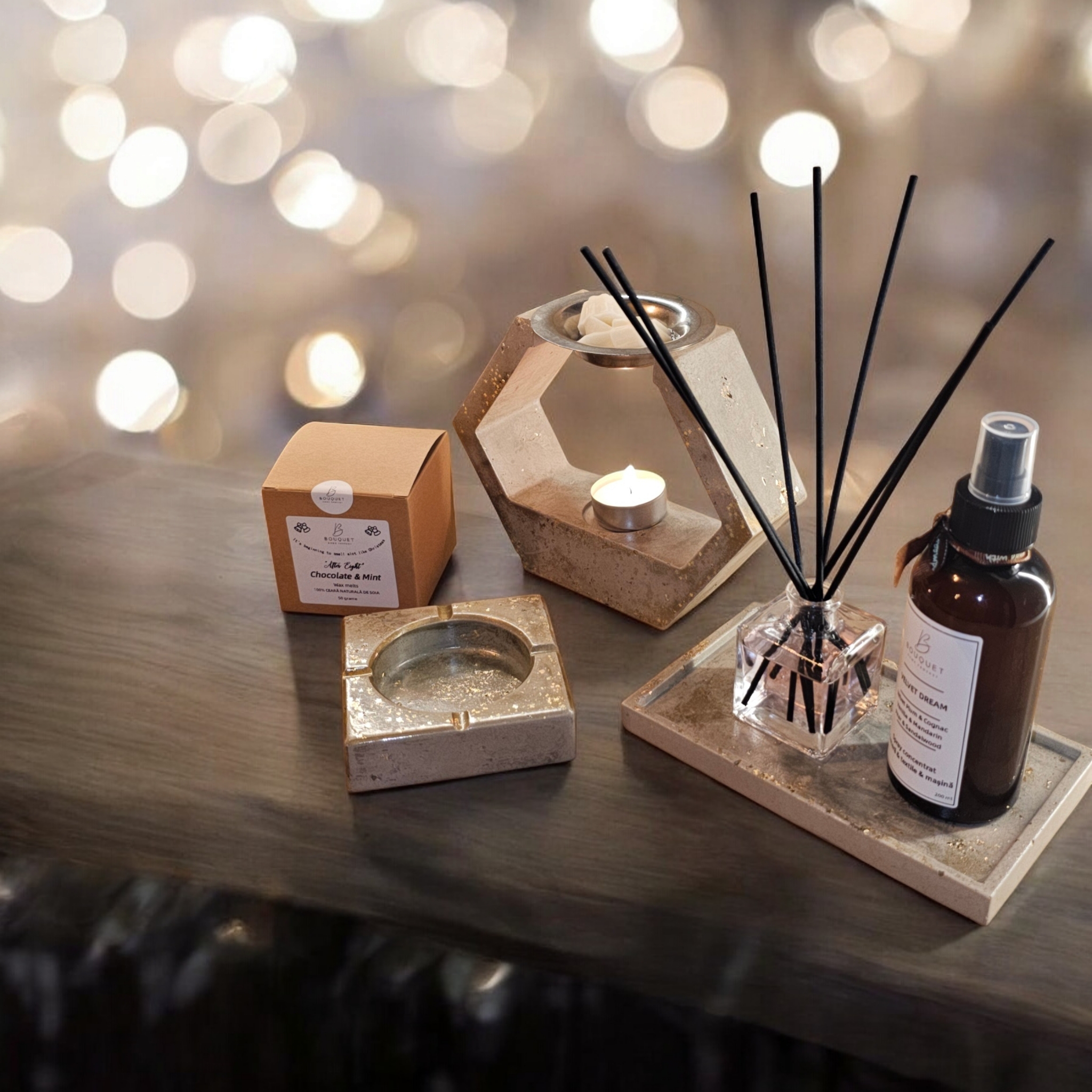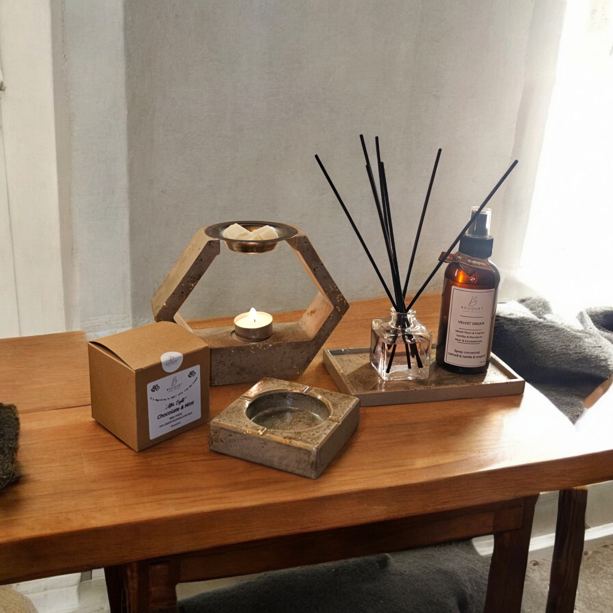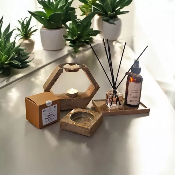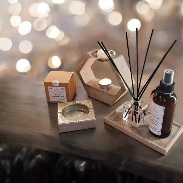 * 1 x 50 grame pastile parfumate (wax melts) - cutie, cu aroma la alegere (parfum la alegere din cele de mai jos, pe care il veti mentiona in casuta "Personalizeaza produsul" )