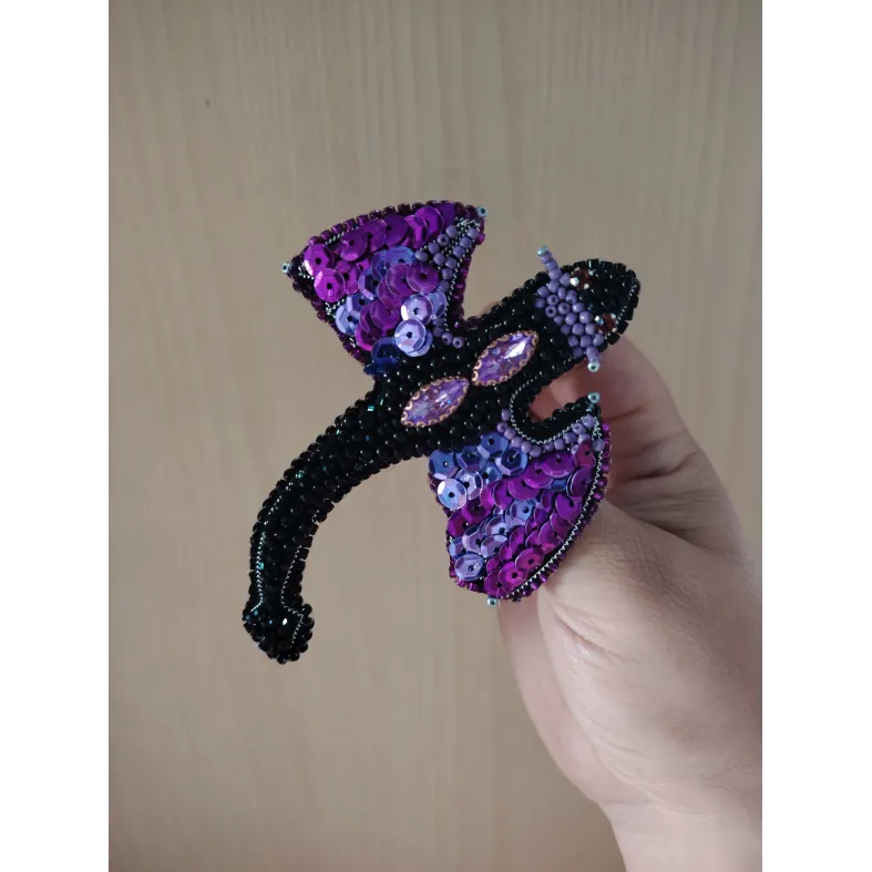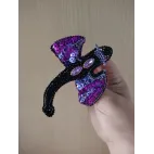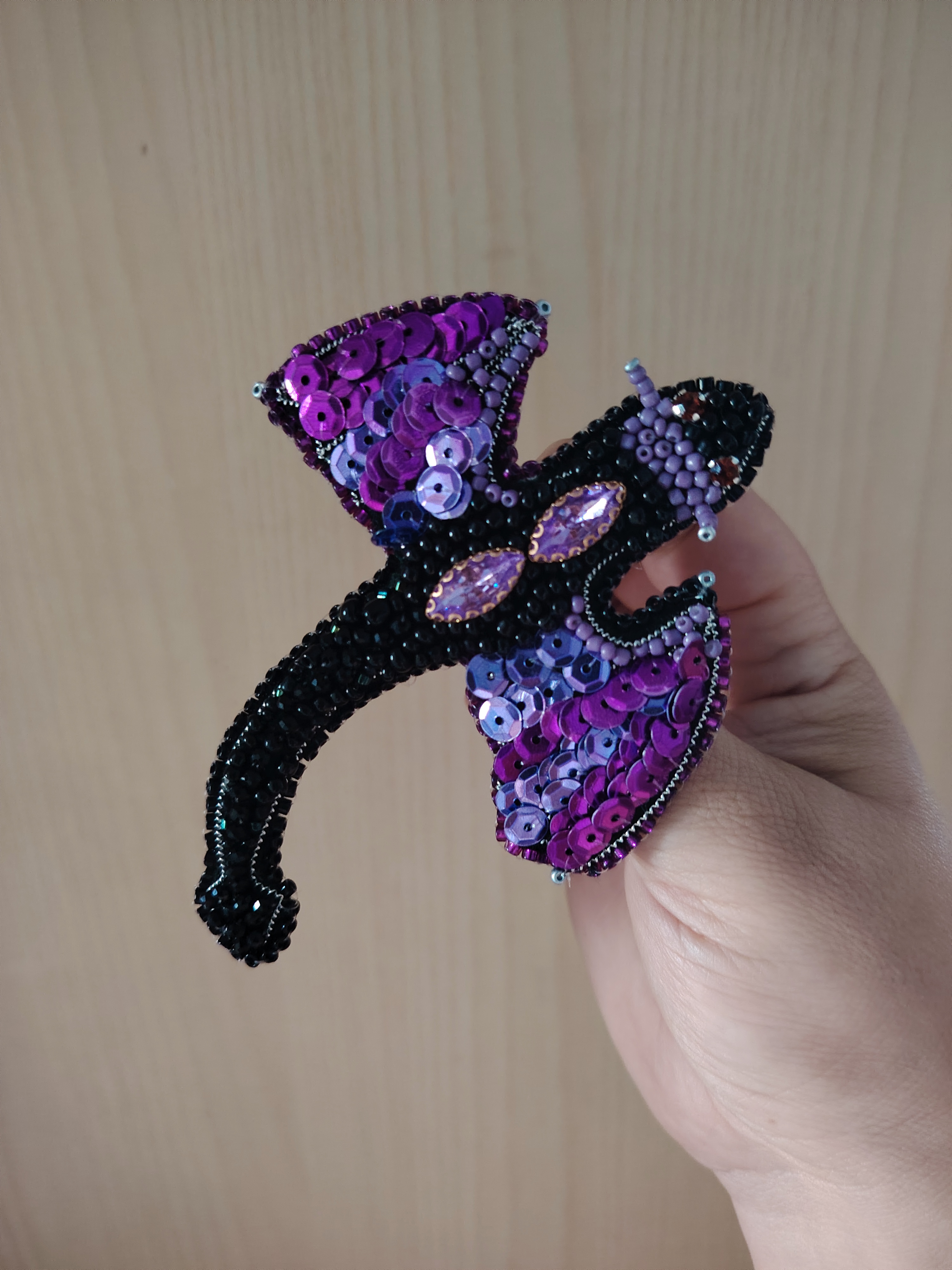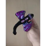Broșă delicată în formă de dragon mov, cusută manual cu mărgele fine și ștrasuri strălucitoare. Nuanțele de violet creează un efect elegant, iar detaliile atent lucrate îi oferă un aspect rafinat și ușor magic.