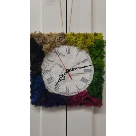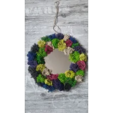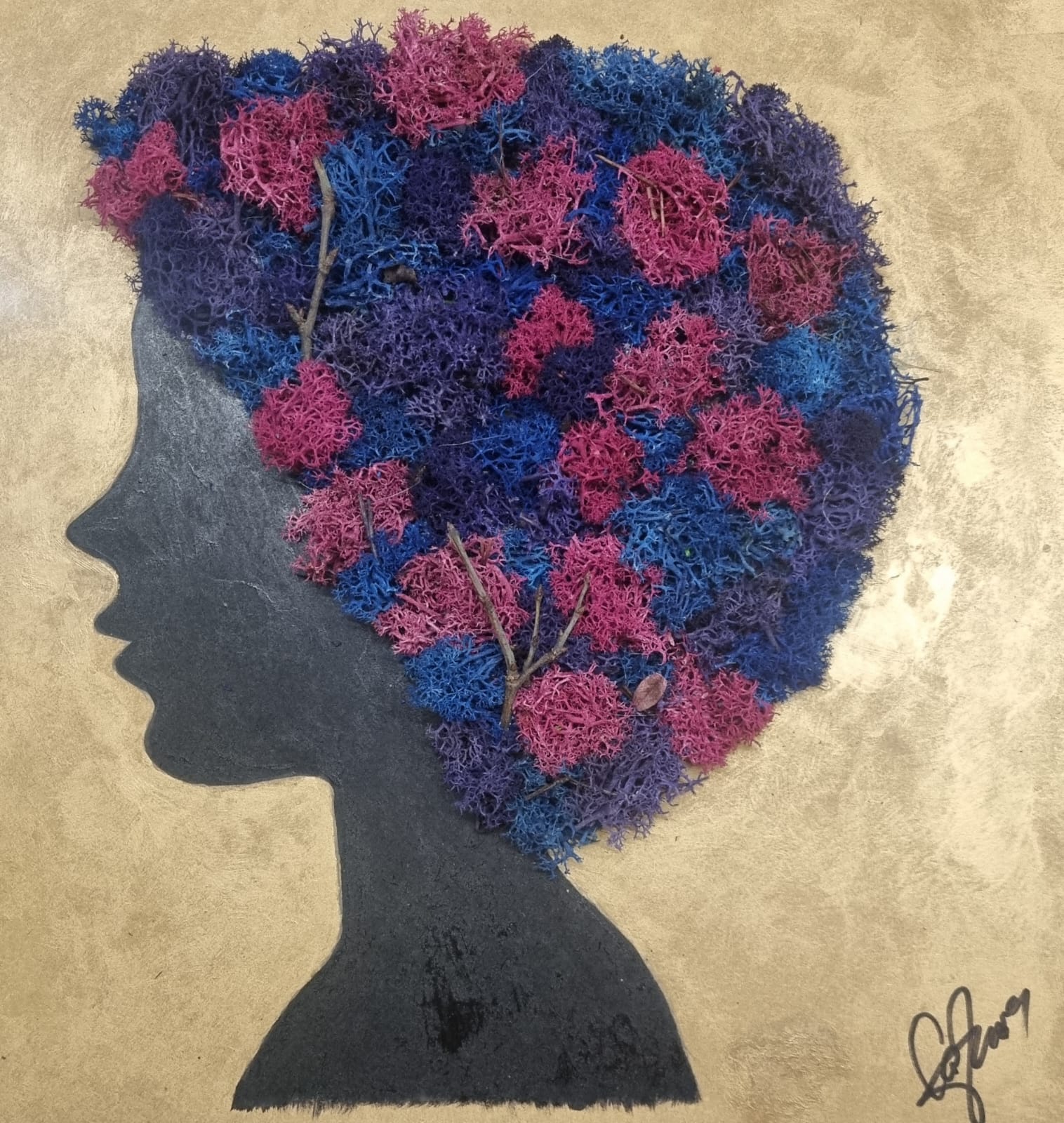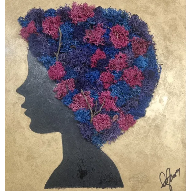 Elementul central al compoziției îl reprezintă coafura realizată integral din licheni naturali conservați, în nuanțe vibrante de albastru, mov și roșu. Textura organică și jocul de culori creează un efect tridimensional spectaculos, transformând lucrarea într-o piesă ce captează privirea instant.