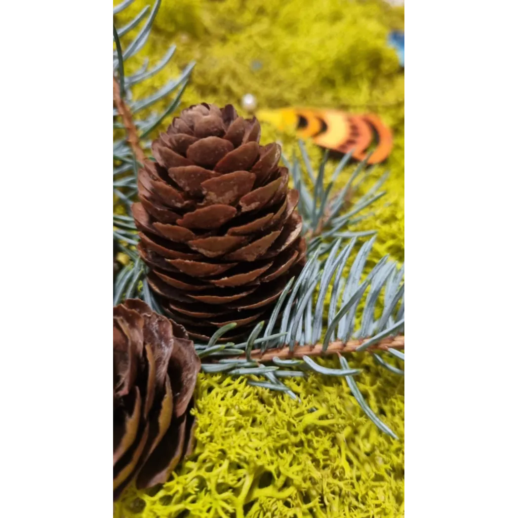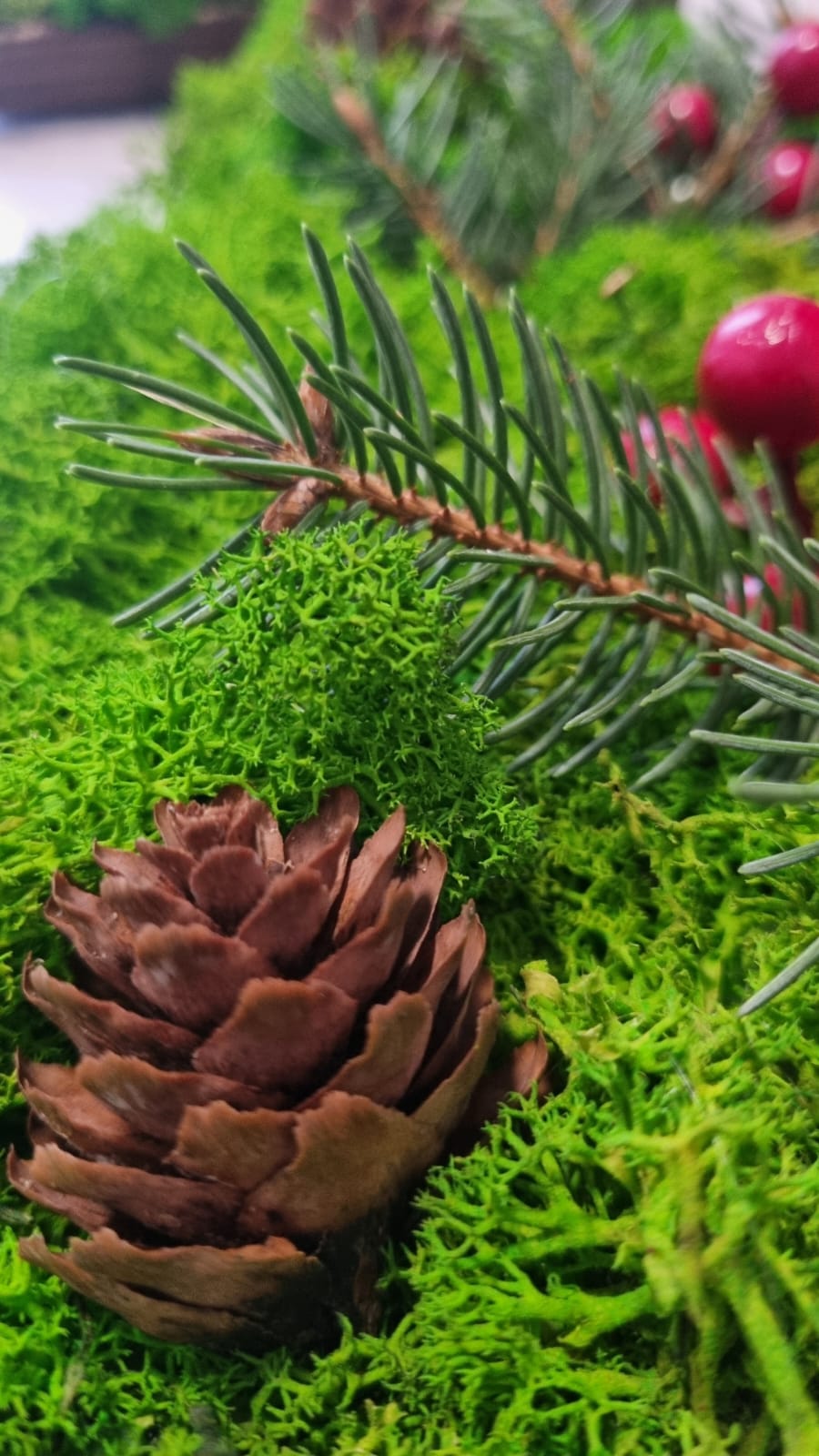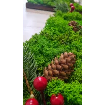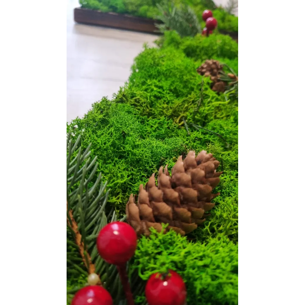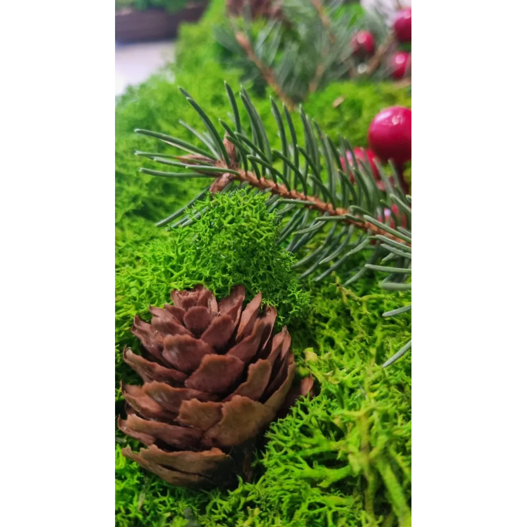 Elemente 100% naturale: licheni verzi premium, bucăți autentice de brad, conuri și accente roșii care aduc un plus de profunzime și căldură.