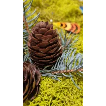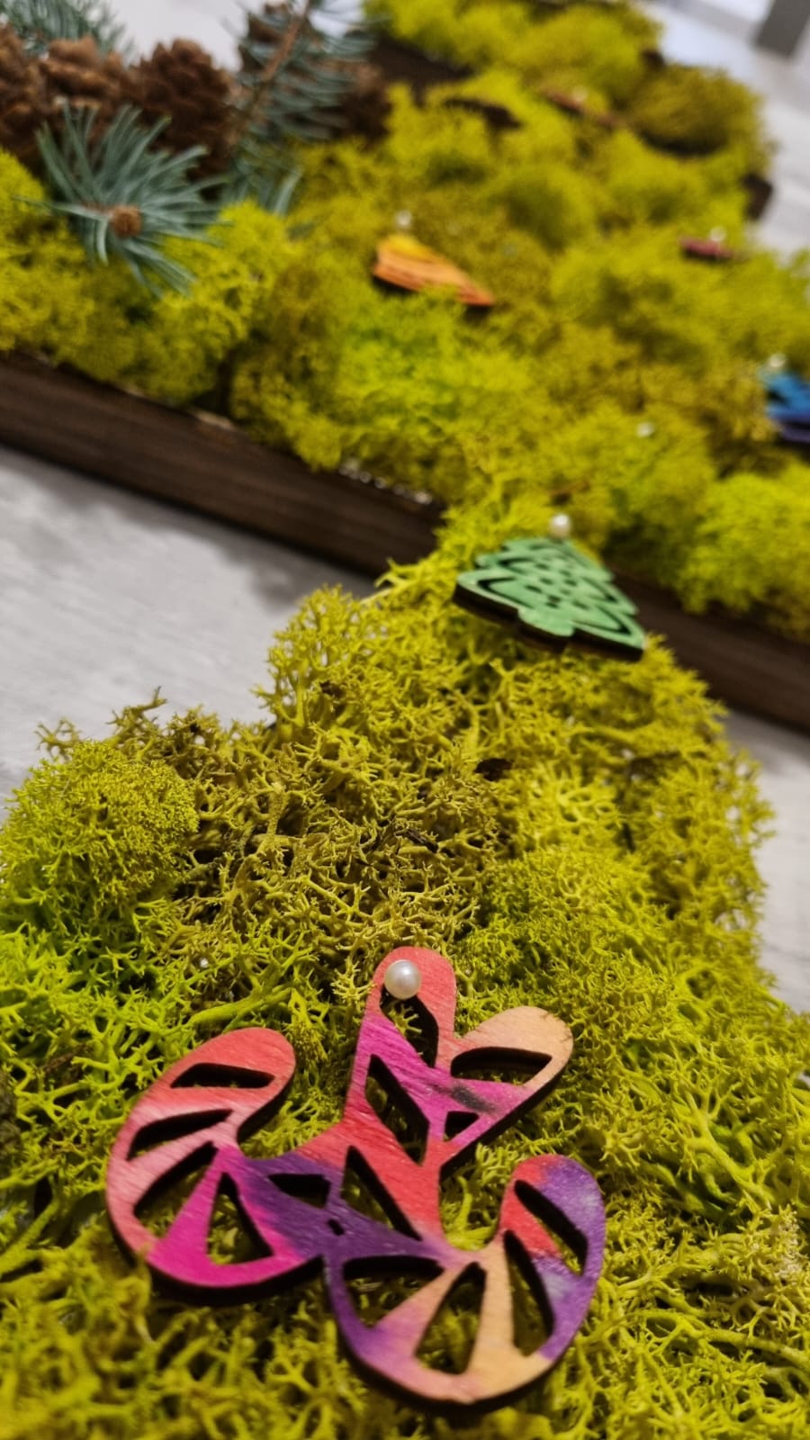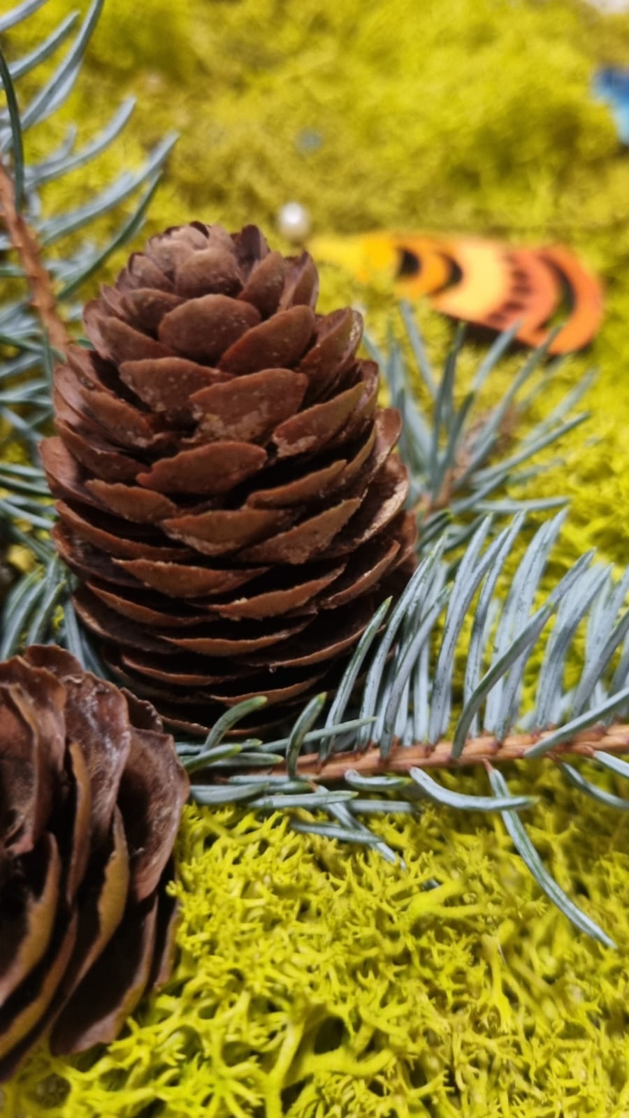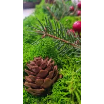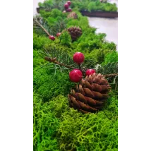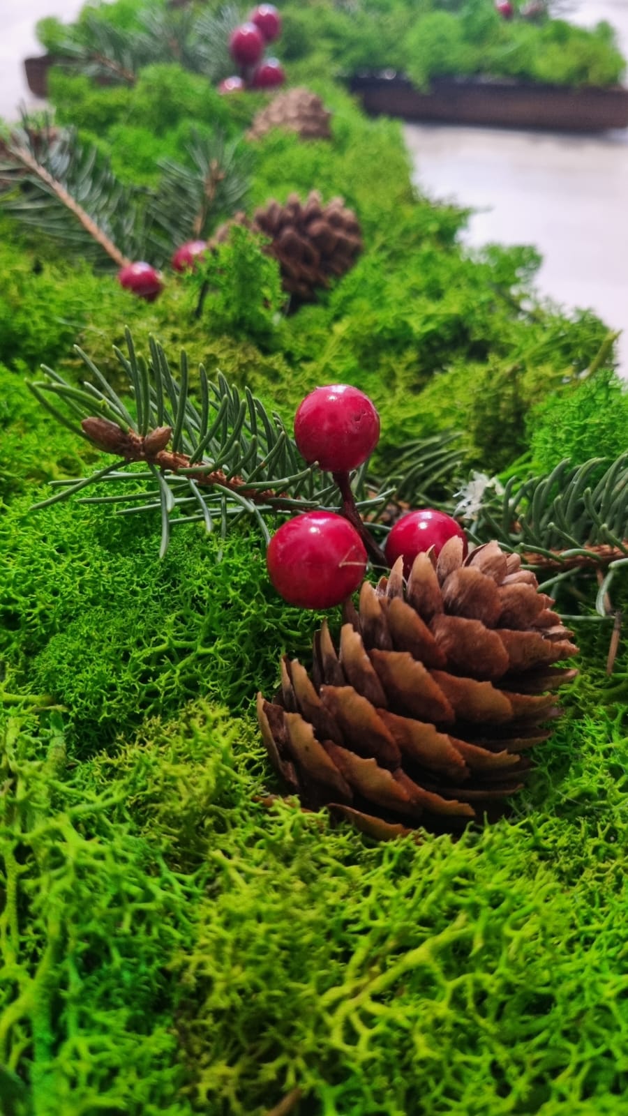 Elemente 100% naturale: licheni verzi premium, bucăți autentice de brad, conuri și accente roșii care aduc un plus de profunzime și căldură.