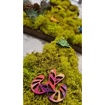 Întreținere zero: licheni conservați, care își păstrează culoarea și textura fără udare sau lumină directă.