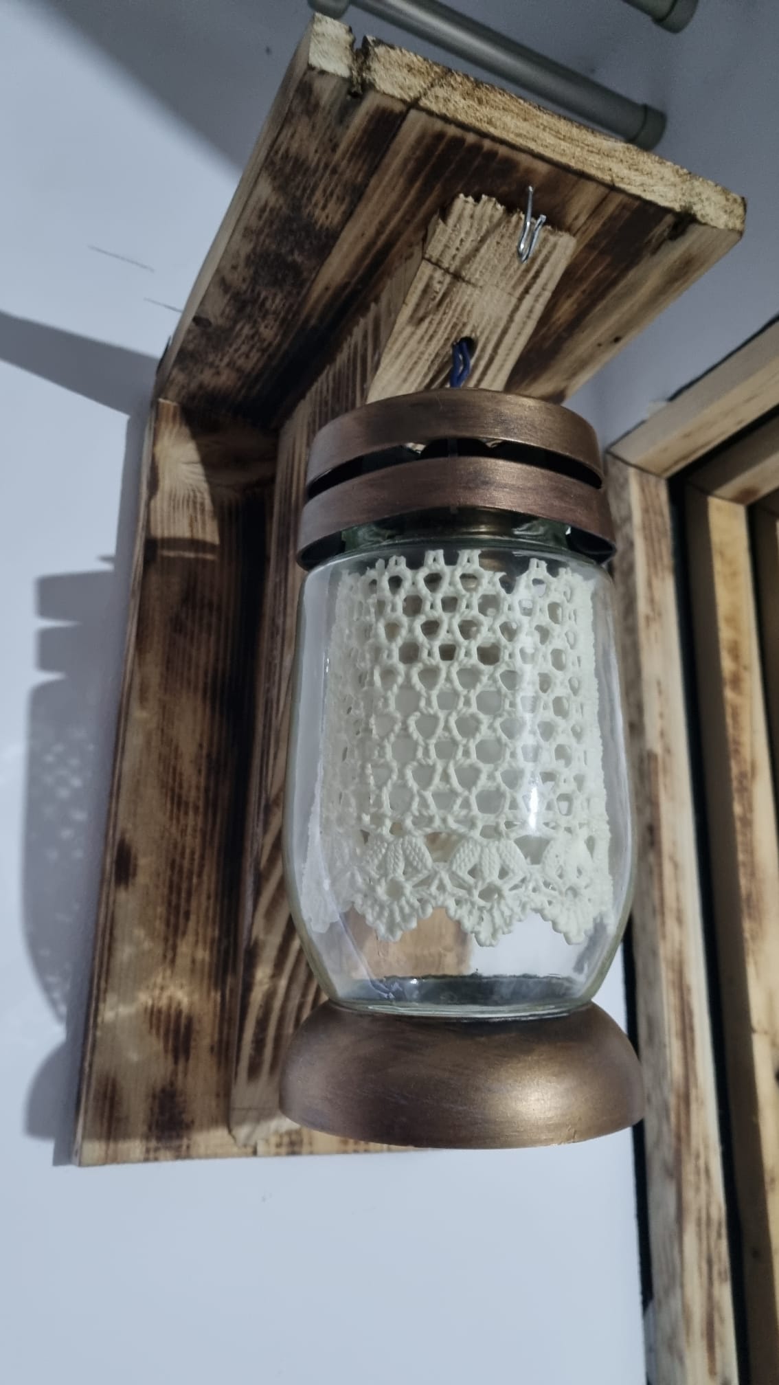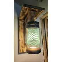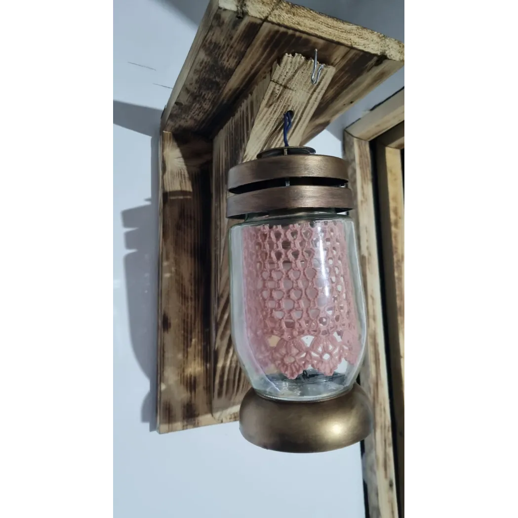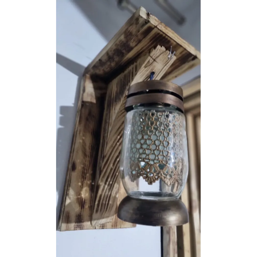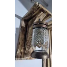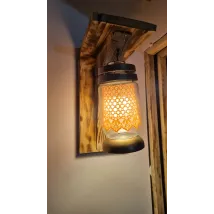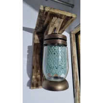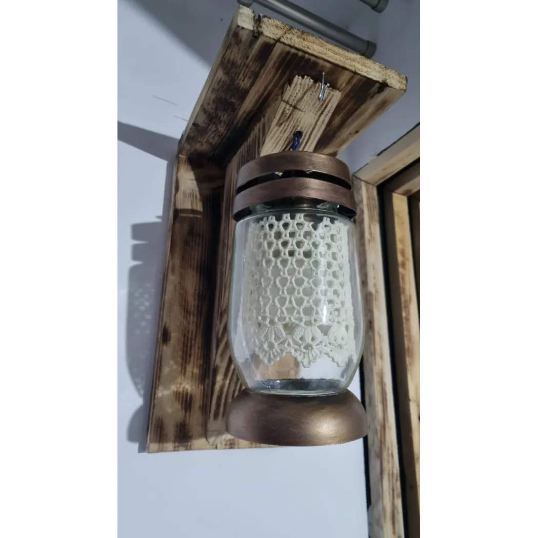 Materiale naturale suport de lemn ars, recuperat din scandura de 2.5 cm grosime, abajur din sticlă vopsit manual (de la un produs la altul poate să difere puțin nuanța)