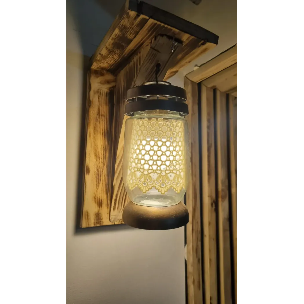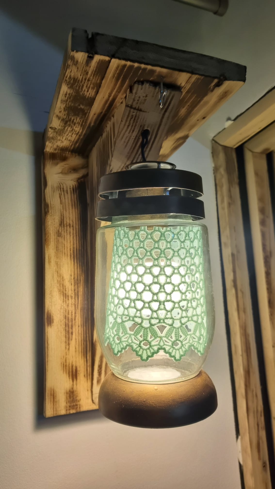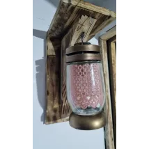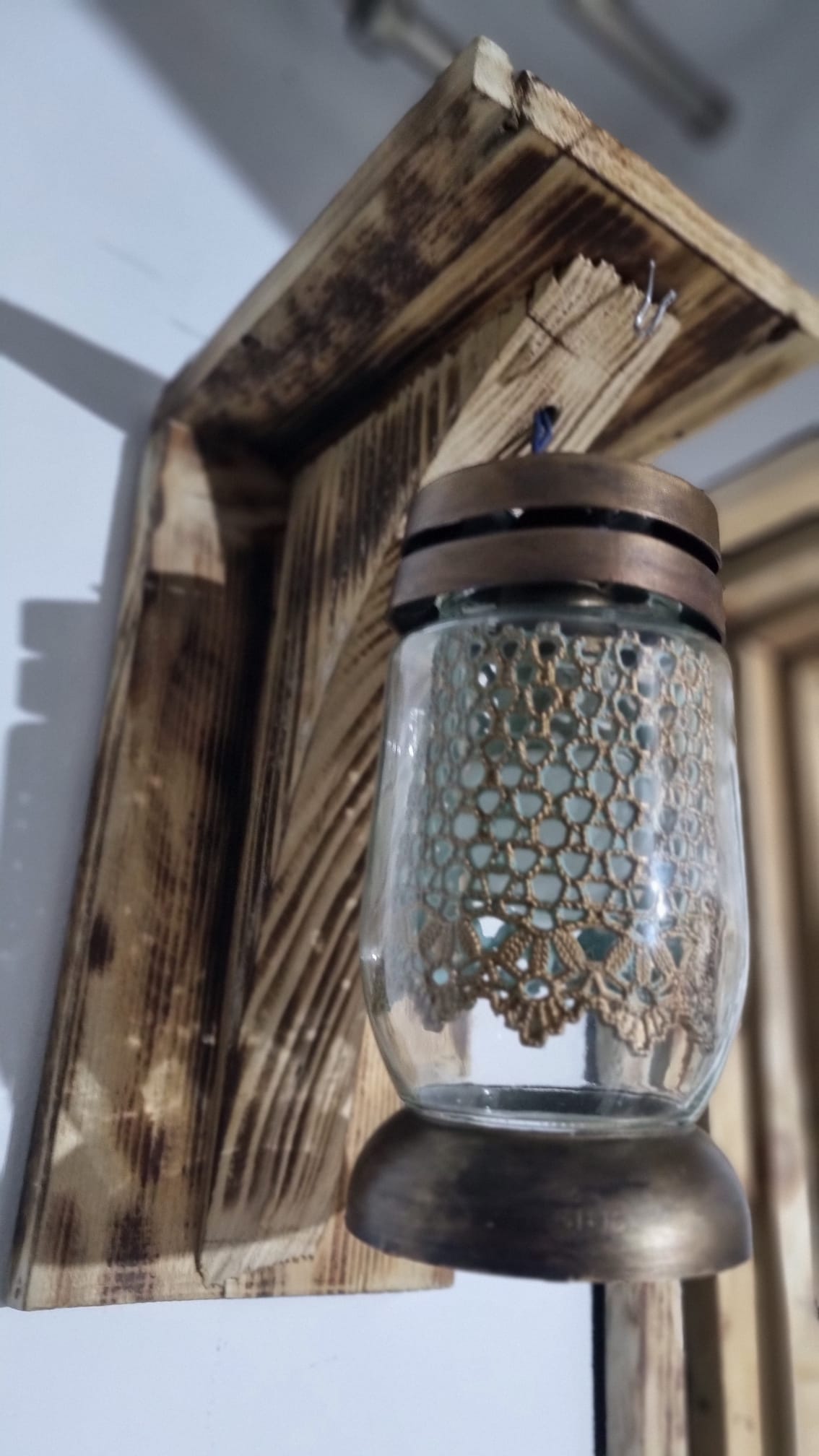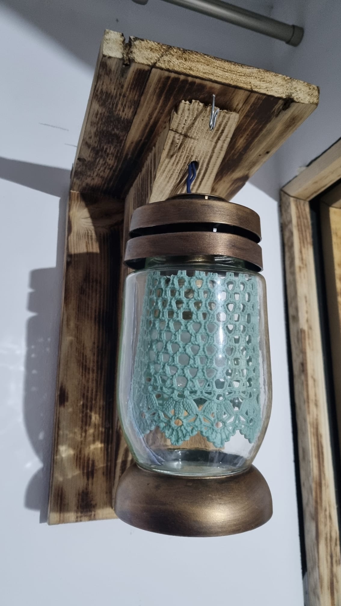 Materiale naturale suport de lemn ars, recuperat din scandura de 2.5 cm grosime, abajur din sticlă vopsit manual (de la un produs la altul poate să difere puțin nuanța)