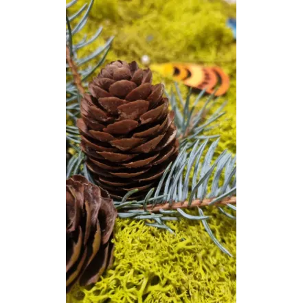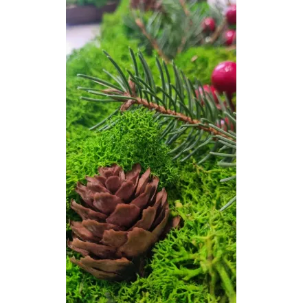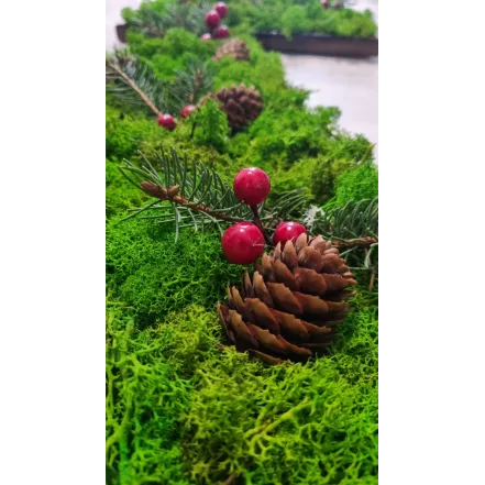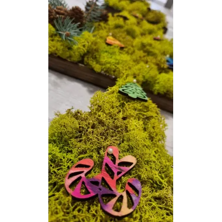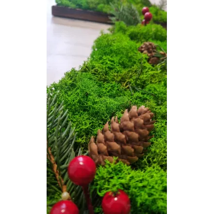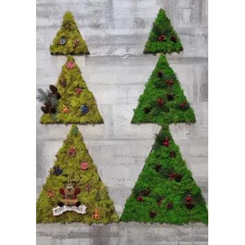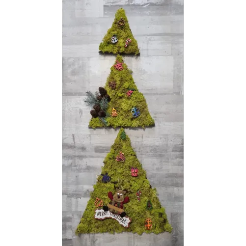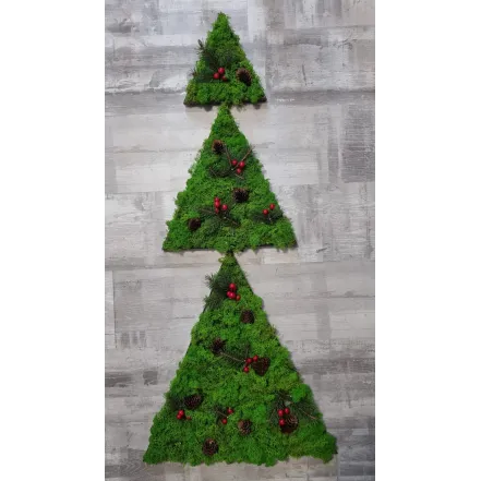 Transformă orice spațiu într-un colț de poveste cu această creație unicat, lucrată manual din licheni naturali, frunziș de brad, conuri de pin și decoruri roșii decorative. Texturile naturale și contrastul culorilor aduc un aer proaspăt și vibrant în orice casă.  Ce îl face special?  Design modular inteligent: cele 3 triunghiuri isoscele se unesc într-un brăduț stilizat, perfect pentru sezonul de Crăciun.  Decor all-season: după sărbători, cele trei piese se pot afișa separat sau în orice formă dorești  ca trei tablouri moderne din licheni, adaptabile oricărui perete.  Elemente 100% naturale: licheni verzi premium, bucăți autentice de...