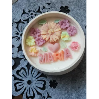 Aranjament floral handmade realizat din flori turnate manual din ceară naturală, așezate cu grijă într-o cutie roșie elegantă, în formă de inimă. Nuanțele pastelate de roz, alb și accente delicate de galben creează o atmosferă plină de gingășie și rafinament, aducând un strop de bucurie și armonie oriunde este așezat.Ideal pentru: cadouri romantice, ocazii speciale precum Ziua Îndrăgostiților, aniversări sau decor delicat pentru casă.Detalii: Materiale: flori turnate manual din ceară naturală Ambalaj: cutie roșie în formă de inimă