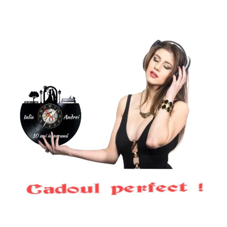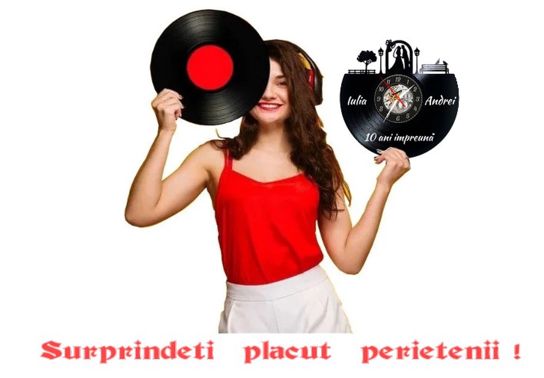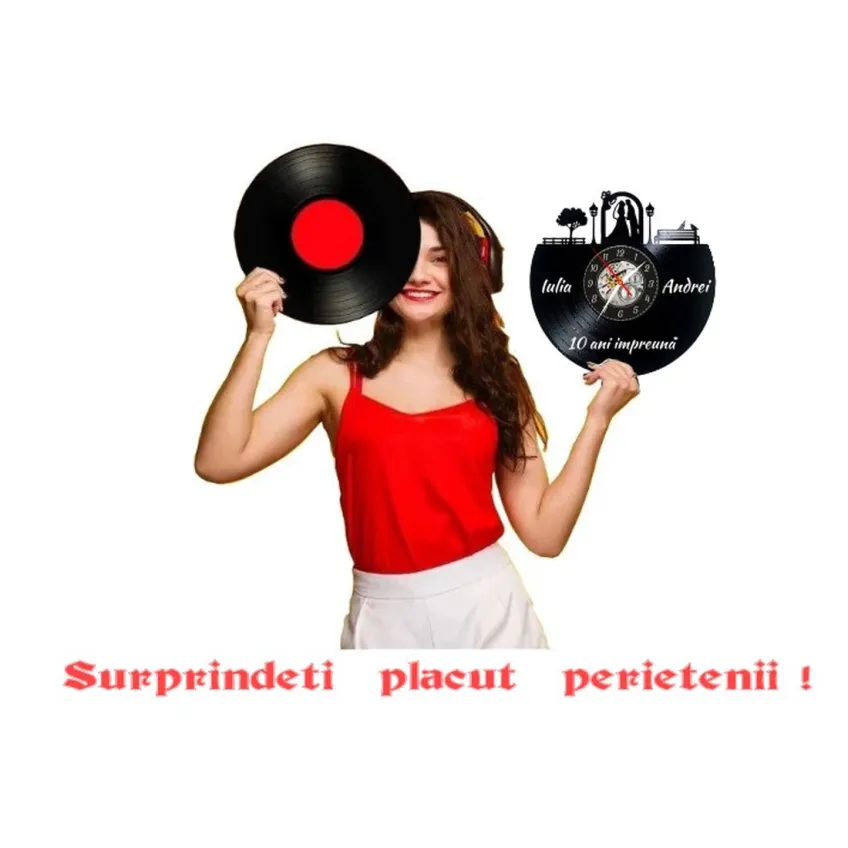 Celebrează momentele speciale cu un cadou care va rămâne în amintire pentru totdeauna! Acest ceas unicat, realizat manual dintr-un disc de vinil autentic, transformă o simplă măsurare a timpului într-o declarație de dragoste eternă.