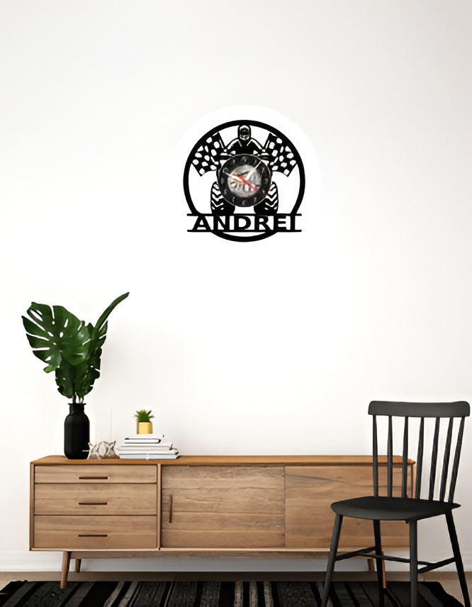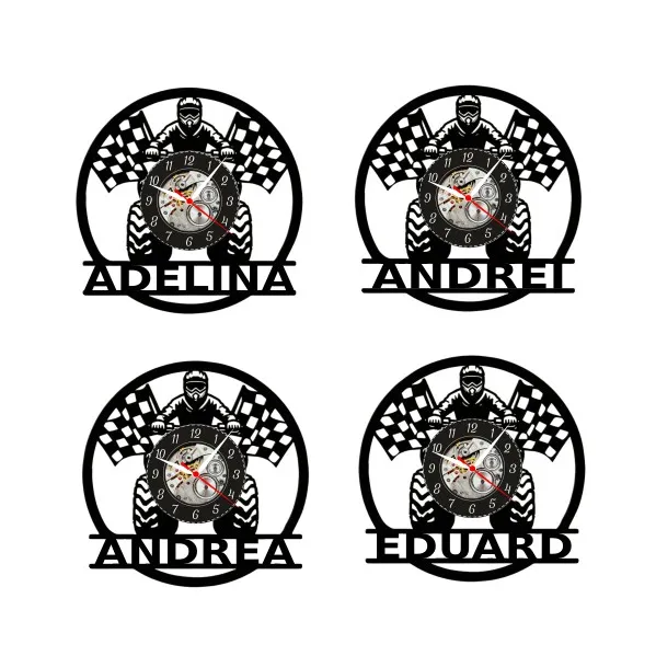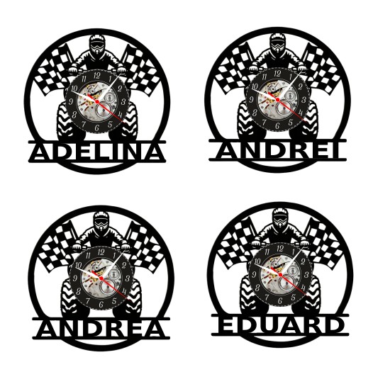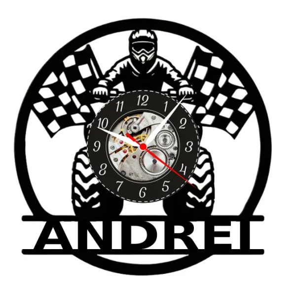 Descoperiți farmecul aventurii off-road cu acest ceas de perete unic, sculptat manual dintr-un disc de vinil autentic. Designul captivant prezintă un rider ATV în acțiune plină de adrenalină, înconjurat de steagurile cu carouri ale competițiilor extreme, toate gravate cu măiestrie artistică în suprafața vinilului negru.