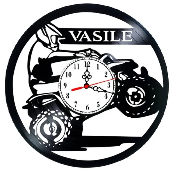 Acest ceas spectacular aduce energia motocross-ului direct pe perete: – **ATV în acțiune** sculptat artistic în siluetă dinamică – **Rider în aventură** surprins în timpul unei curse off-road spectaculoase – **Text personalizabil** care poate fi adaptat cu orice nume dorit – **Cadran central clasic** cu numere arabe clare și accesoriu roșu – **Compoziție echilibrată** care transmite putere și aventură