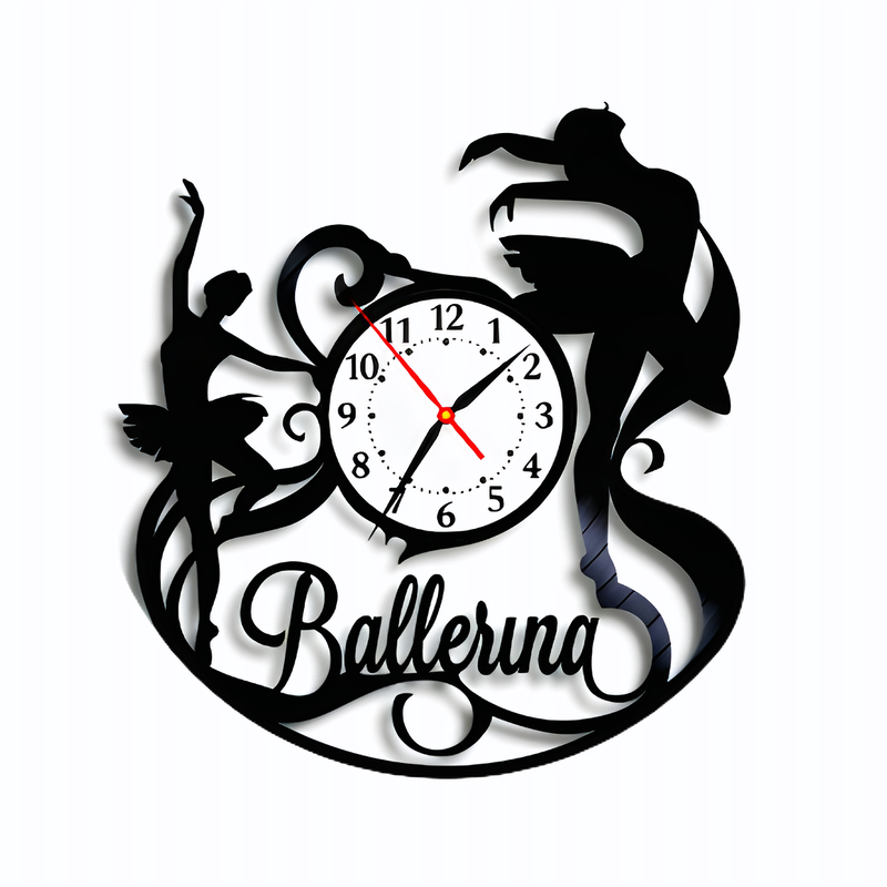 **Design Plin de Grație:** – Siluete elegante de balerine în diverse poziții clasice de balet – Linii fluide și ornamente decorative care sugerează mișcarea – Scrierea caligrafică “Ballerina” integrată artistic în design – Cadran alb clasic cu numere clare și ace roșii expresive – Compoziție circulară care creează senzația de dans continuu