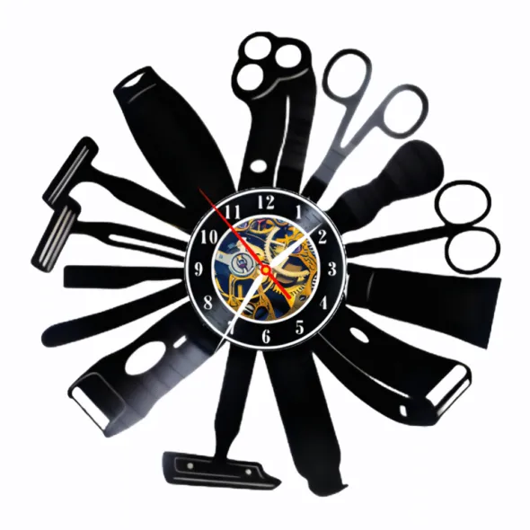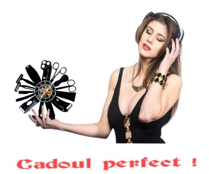 Descriere ironic-coafantă: Ceas de perete care arată clar două lucruri: ora exactă și că pe peretele ăsta a trecut un frizer cu stil. Plin de instrumente de coafat – foarfeci, piepteni, lame, spray, foehn – toate aranjate în cerc ca un ritual secret al tunsorii perfecte. În mijloc: rotițe care nu tund nimic, dar ticăie cu atitudine.