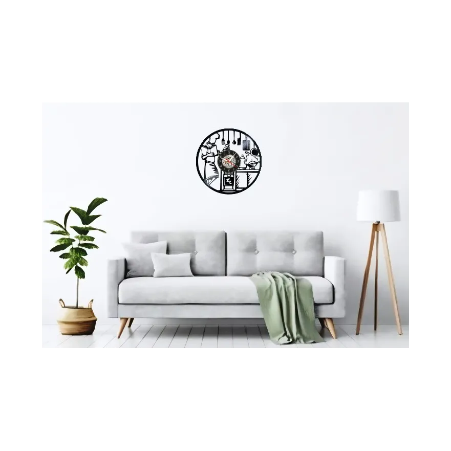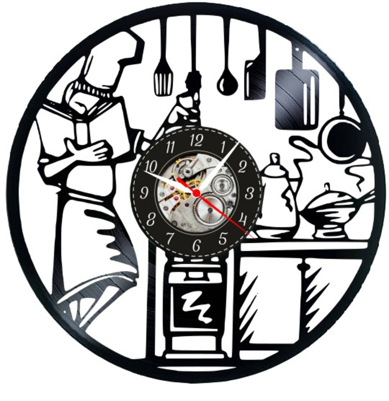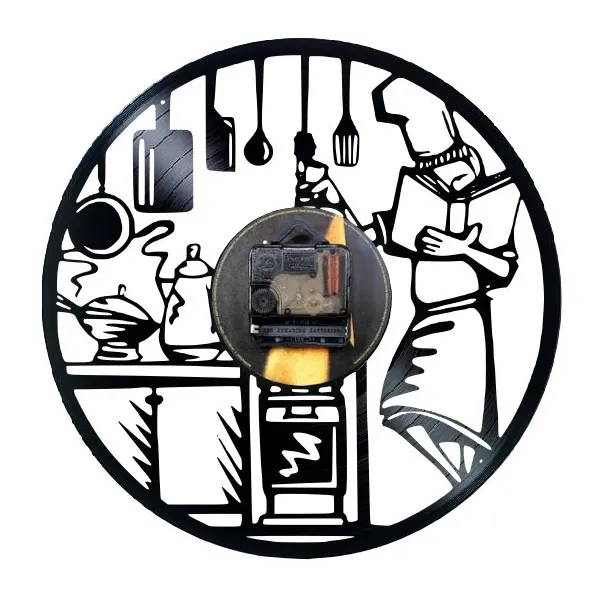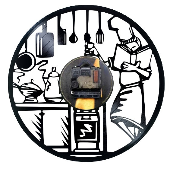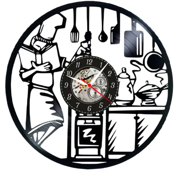 Vă prezentăm o creație artistică deosebită pentru pasionații de gastronomie și design interior: ceasul de perete Bucătărie Gourmet, sculptat cu măiestrie dintr-un disc de vinil autentic.