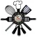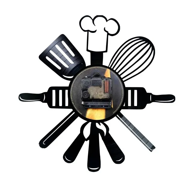 Această piesă decorativă ingenioasă transformă un disc de vinil clasic într-o operă de artă funcțională care celebrează universul culinar. Designul unic prezintă o compoziție radială de ustensile esențiale pentru orice bucătar pasionat, aranjate artistic în jurul mecanismului central al ceasului. Fiecare element este decupat cu precizie din suprafața neagră a discului: o tocă clasică de bucătar în partea superioară, un tel pentru bătut în stânga, o spatulă în dreapta, un făcăleț în partea inferioară, linguri și furculițe de servire, toate intercalate cu alte instrumente indispensabile din arsenalul culinar.