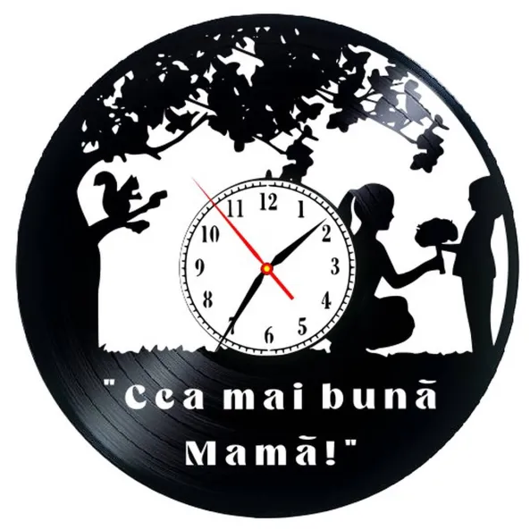 Descriere cu suflet și simbol: Acest ceas de perete este o declarație sinceră și vizuală de iubire. Silueta copacului cu frunze și veveriță sugerează viața, căldura și continuitatea. În partea dreaptă, un gest plin de emoție: cineva oferă un buchet de flori unei figuri feminine – mamă, bineînțeles. Mesajul scris în română, „cea mai bună Mamă!”, transformă ceasul într-un omagiu profund pentru femeia care a fost mereu acolo, la orice oră din zi și noapte.