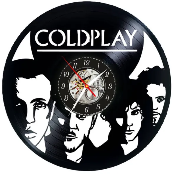 Descriere cu emoție muzicală și estetică artizanală: Acest ceas de perete este un tribut vizual adus trupei Coldplay, transpus într-o piesă de decor cu suflet artistic. Realizat dintr-un disc de vinil, ceasul prezintă în partea superioară numele trupei “COLDPLAY”, iar în partea inferioară sunt decupate fețele membrilor formației – o surpriză grafică discretă, dar recognoscibilă pentru fani. Mecanismul central, cu rotițele expuse și ace roșu cu alb, oferă un contrast vizual dinamic, ca un solo de pian peste un refren emoțional.