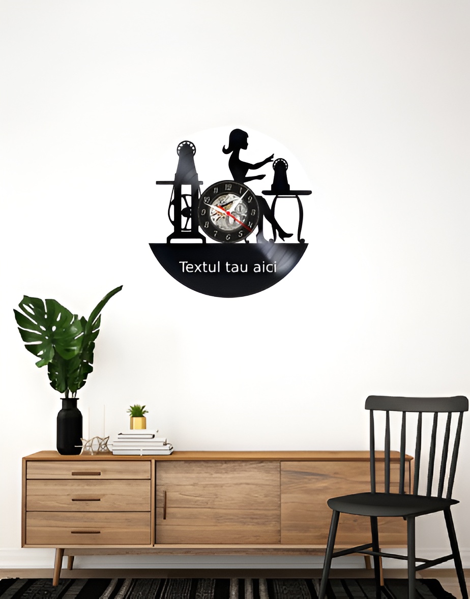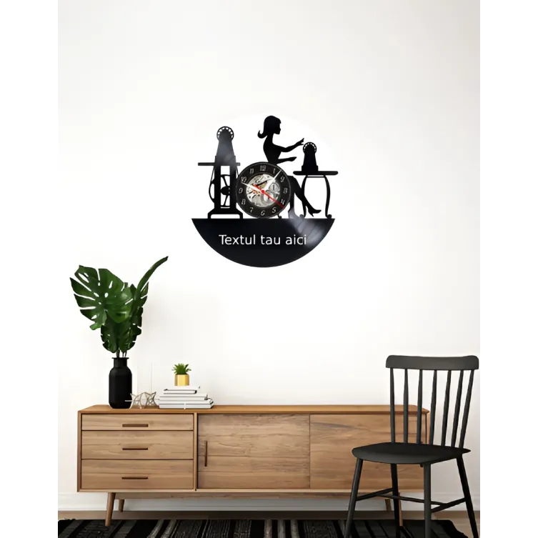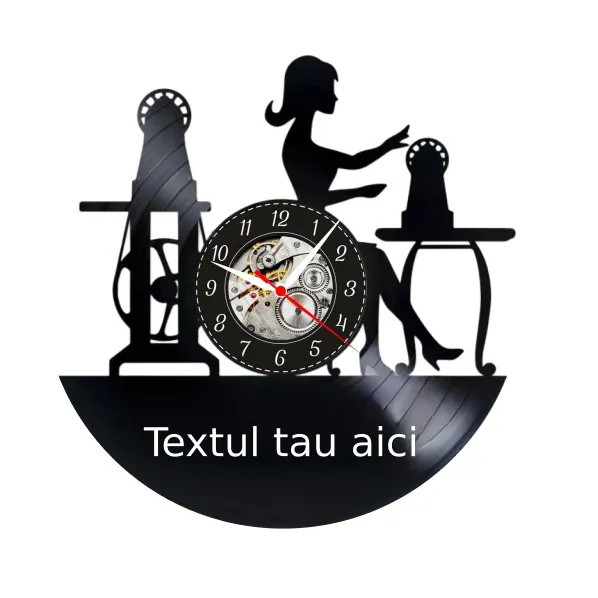 MATERIAL:Ceasul de perete este fabricat din disc de vinil( pickup) folosit. Suprafața poate avea zgârieturi minore, dar nu afectează aspectul. MECANISM: Mișcarea este continuă și silențioasă.(Nu ticăie) CADRANUL:ceasului este un autocolant dublu laminat Modelul poate fi ales din fotografia de prezentare al produsului menționând nr. autocolantului dorit INDICATOARE DE CEAS: Folosim numai indicatori din aliaj de aluminiu, rezistență puternică la coroziune, precizie și durabilitate. DIAMETRU: 30cm (12 “inch). Baterie: AA (nu este inclusă).