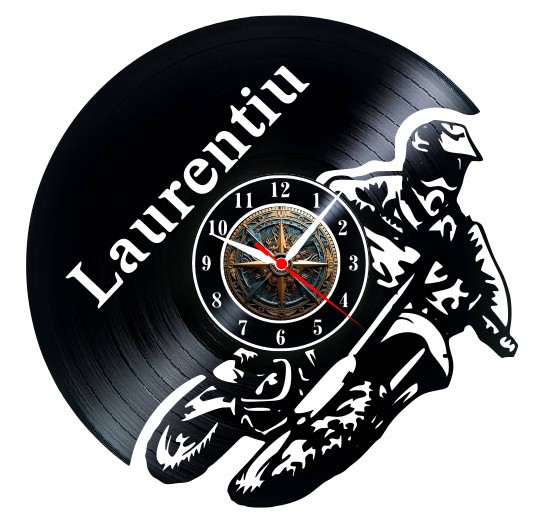 - Personalizare Specială: Numele "Laurențiu" (sau orice alt nume, număr de concurs, slogan motivațional sau poreclă din lumea moto) este integrat organic în structura designului. Această notă personală transformă ceasul dintr-un decor într-o piesă de memorabilia cu valoare sentimentală de neprețuit, perfectă pentru a marca o reușită importantă în cariera sportivă.