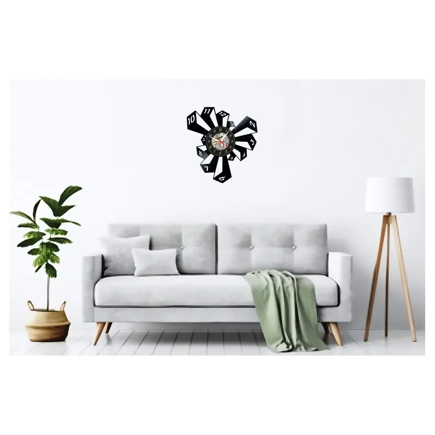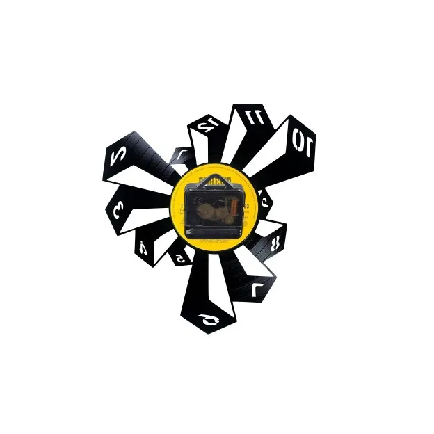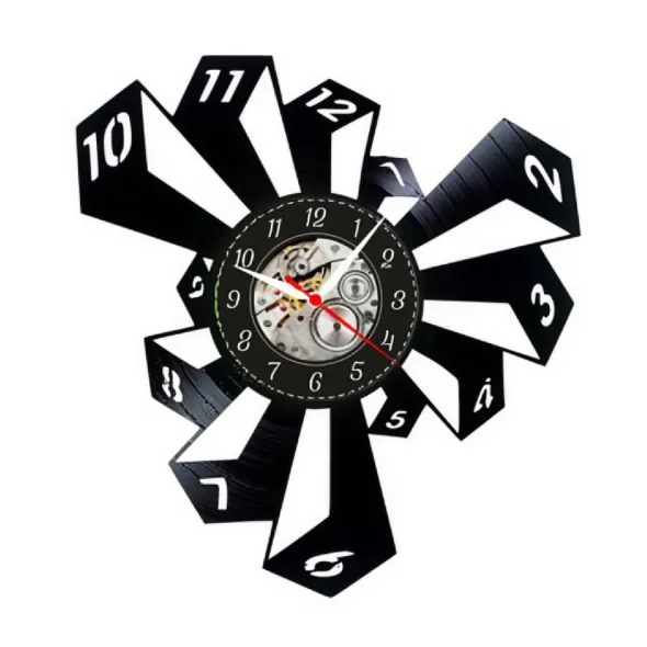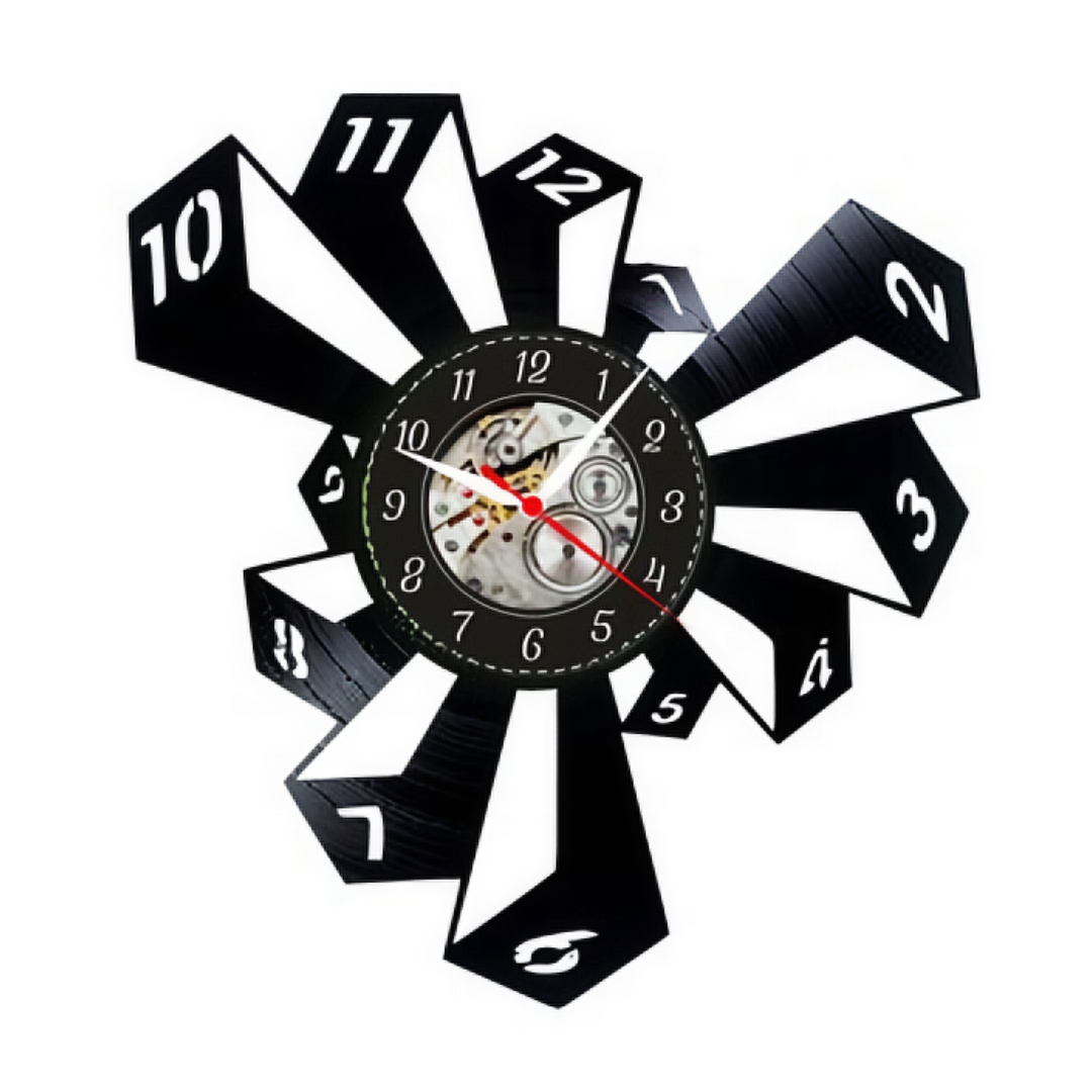 Diametru: 30 cm Material: Disc de vinil autentic Mecanism: Quartz silențios Baterie: 1 x AA (neinclusă) Design: Decupat manual cu precizie artistică Caracteristici: Raze geometrice tridimensionale cu cifre