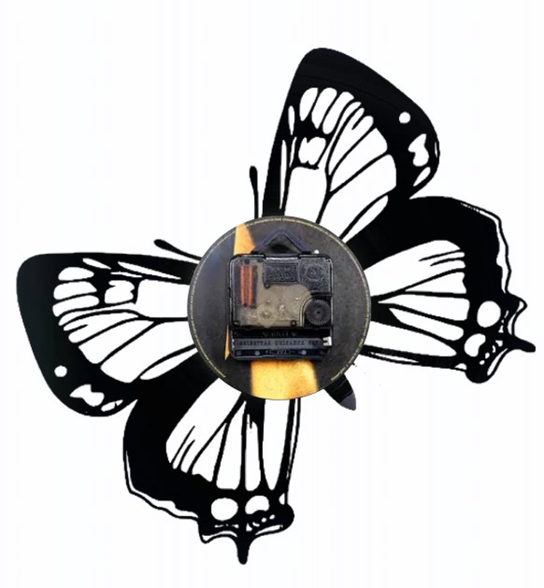 Mecanismul orologiului este integrat subtil în centrul compoziției, iar acele ceasului par să danseze peste aripile fluturelui, marcând trecerea timpului într-un mod poetic. Fiecare detaliu este lucrat manual cu atenție, transformând un disc de vinil vintage într-un accesoriu contemporan pentru decorarea pereților.