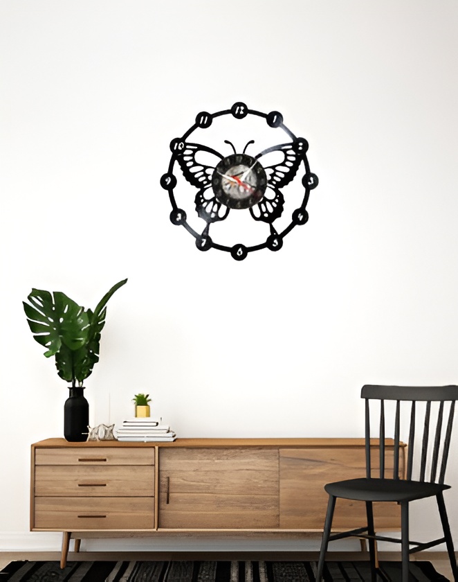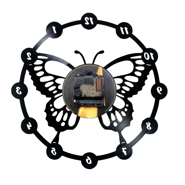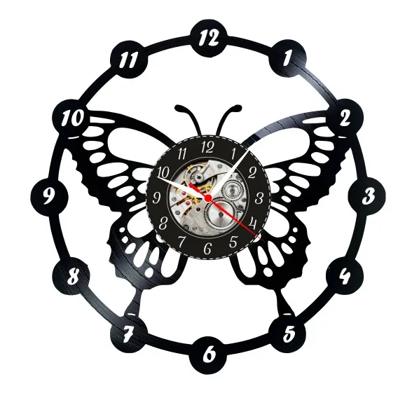**Caracteristici Artistice:** – Confecționat manual din disc de vinil LP original – Design fluture cu detalii complexe ale aripilor – fiecare nervură și model sunt gravate cu precizie – Cadran central transparent cu mecanism aparent, stil vintage-industrial – Numerele orelor plasate pe cercuri decorative pentru un aspect unic – Acul roșu elegant pentru contrast și vizibilitate optimă – Diametru: ~30cm (dimensiune standard LP)