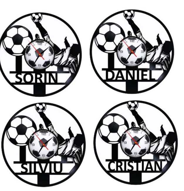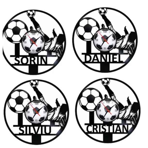 Descriere cu opțiune de personalizare și glumă de cronicar sportiv: Ceas de perete pentru fanii fotbalului care știu că cele mai importante secunde nu sunt între 1 și 45, ci între 90 și… cât dă arbitrul. Cu fundal în stil minge de fotbal, un jucător în foarfecă pe post de secundar simbolic, și spațiu dedicat personalizării cu un nume, o poreclă sau chiar un slogan preferat – acest ceas nu se limitează la oră, ci spune o poveste pe perete.