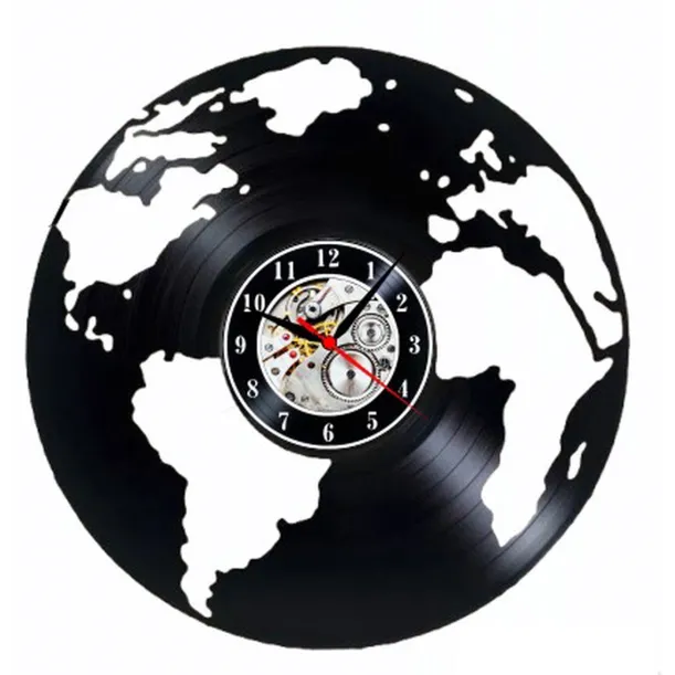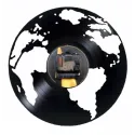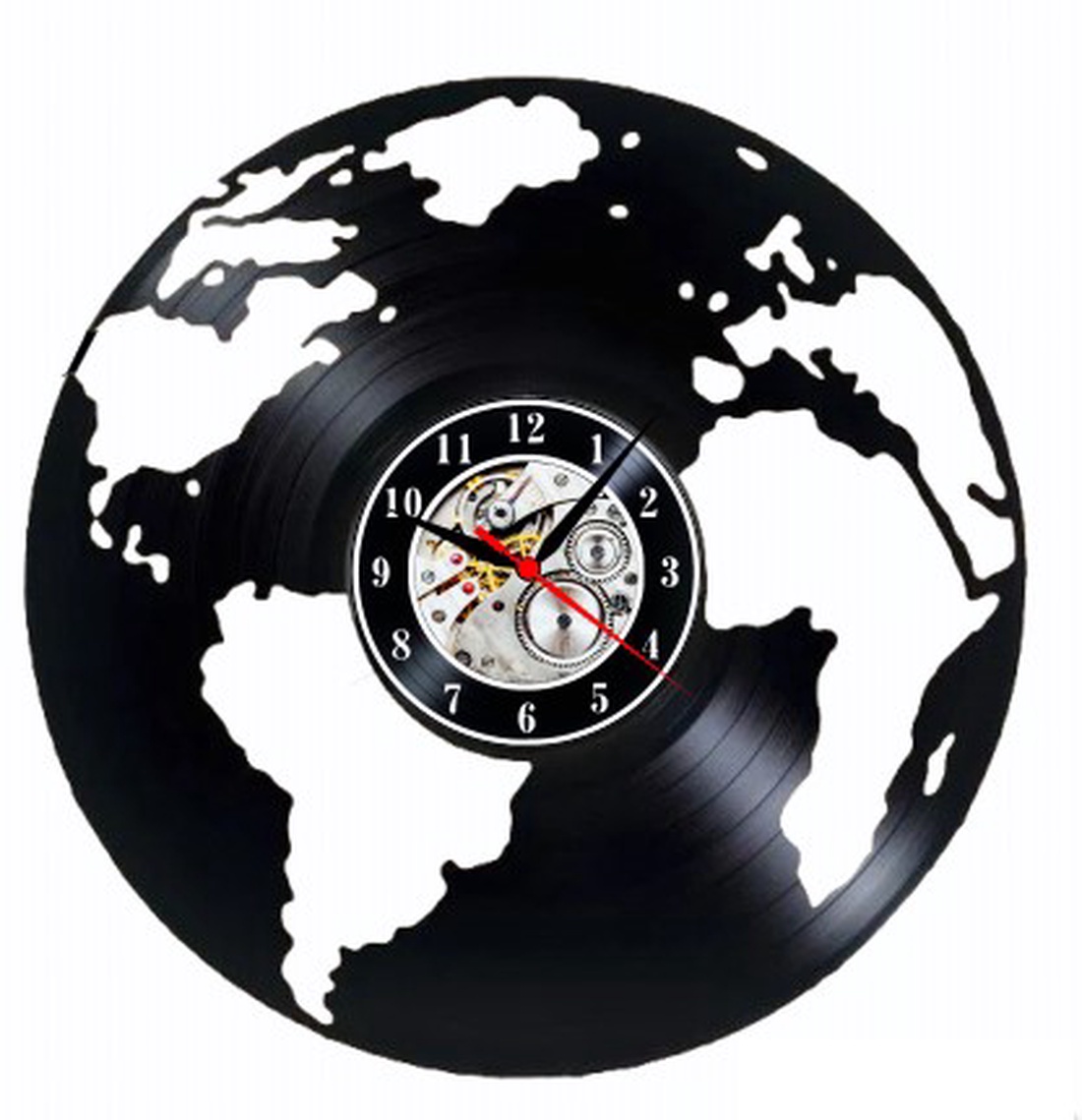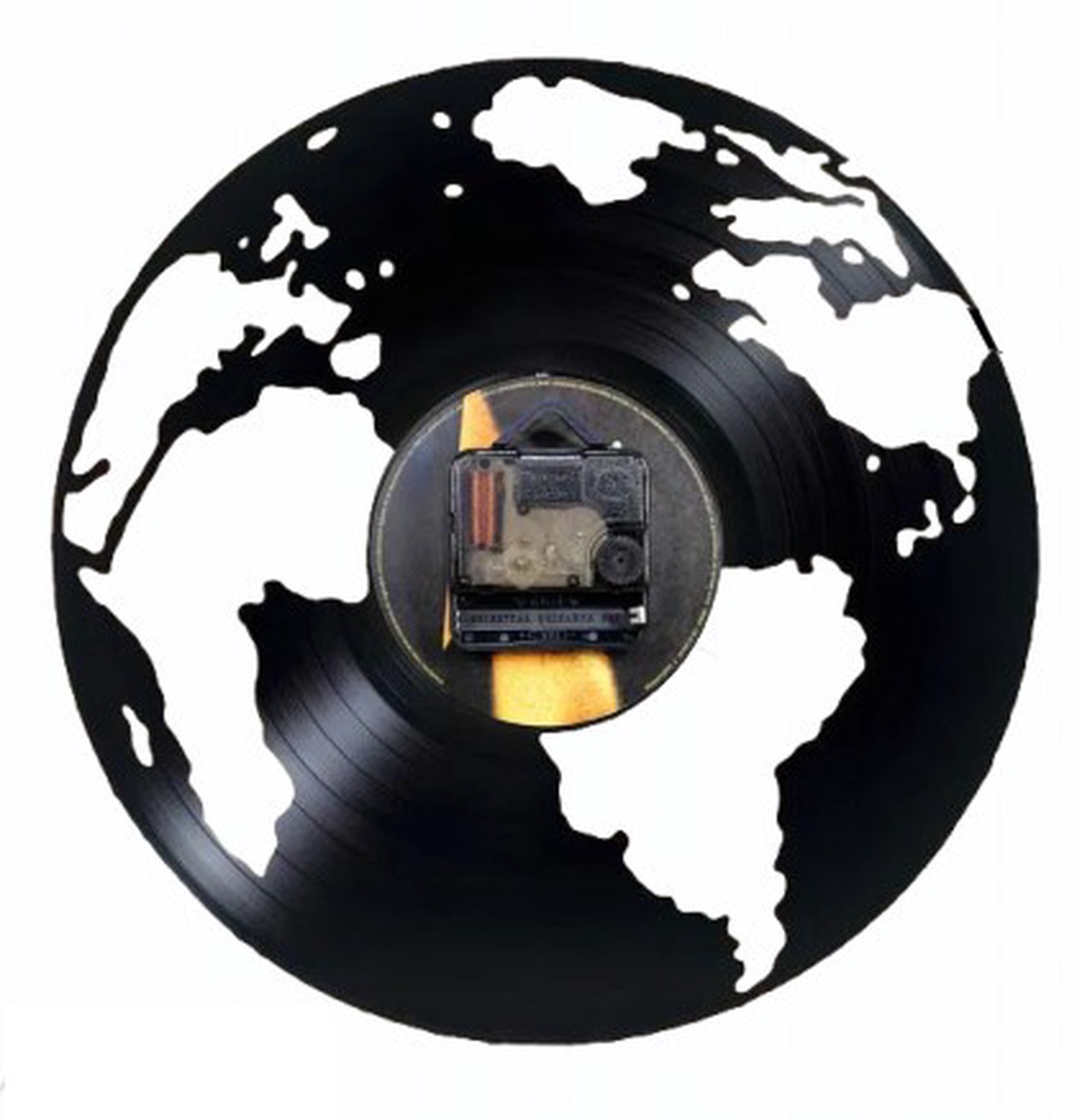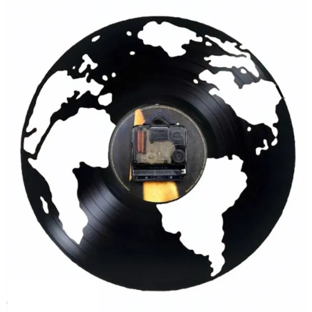 Acest ceas remarcabil este creat manual dintr-un disc de vinil autentic, transformat cu măiestrie într-o reprezentare artistică a globului pământesc.