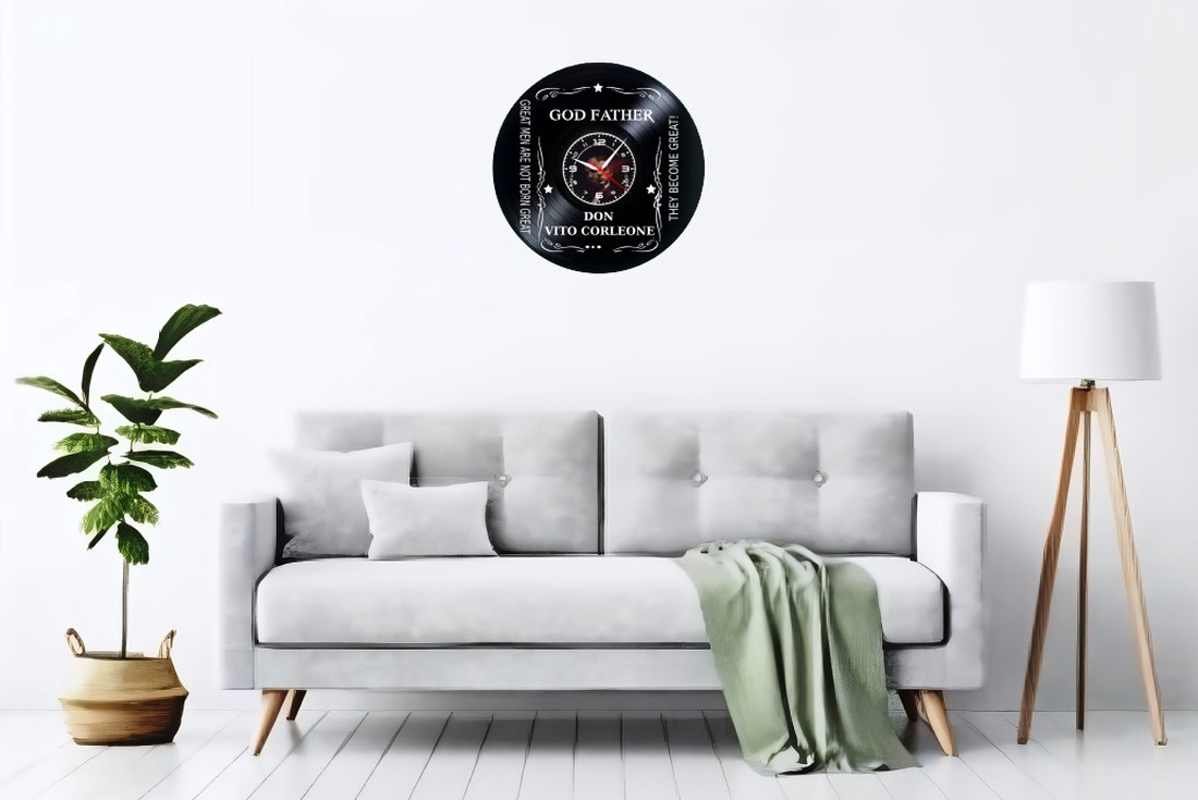 Descoperă o piesă unică de decor care îmbină nostalgia discurilor de vinil cu eleganța cinematografică - ceasul de perete "The Godfather", creat manual din autenticul disc de vinil.