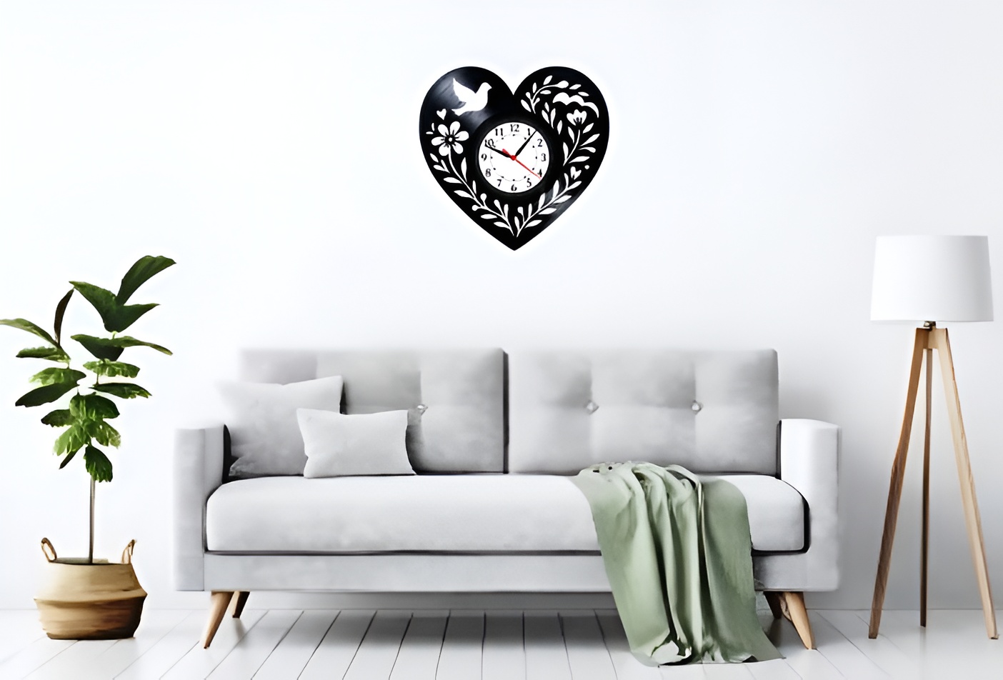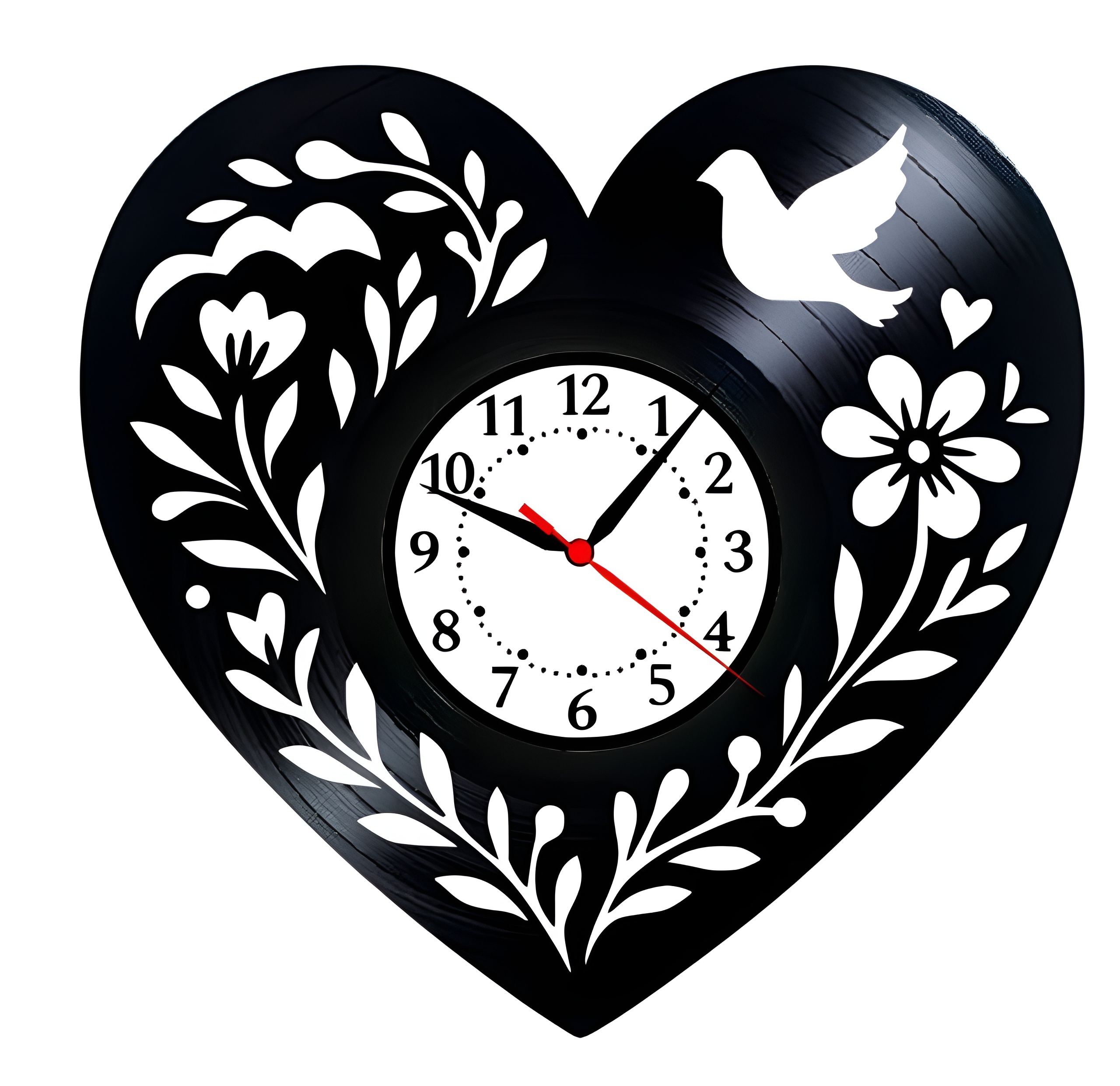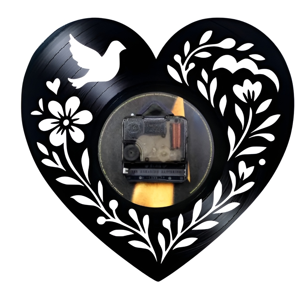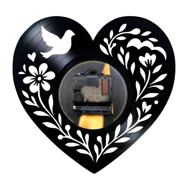Decorați-vă căminul cu acest ceas de perete încântător, realizat manual dintr-un disc de vinil autentic, în forma simbolică a unei inimi. Această creație artistică unică îmbină eleganța naturală cu romantismul, prezentând un design delicat cu flori, frunze și un porumbel grațios, toate decupate cu precizie din vinilul original. Nu este doar un instrument de măsurare a timpului, ci o pildă vizuală a iubirii eterne.
