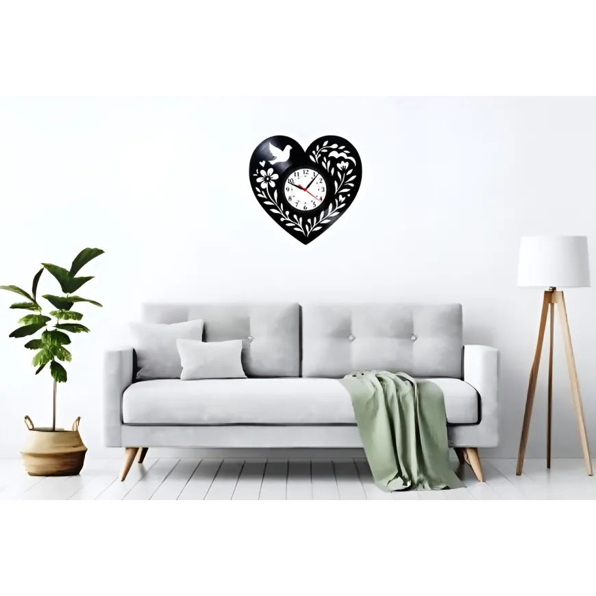 Designul acestui ceas de perete în formă de inimă este încărcat cu semnificație. Forma de inimă reprezintă dragostea profundă și afecțiunea, fiind cel mai universal simbol al conexiunii umane. Elementele florale decupate simbolizează frumusețea, efemeritatea și reînnoirea naturii, la fel ca o relație care înflorește. Porumbelul grațios întărește tema, fiind un simbol atemporal al păcii, fidelității și angajamentului. Împreună, aceste elemente creează o atmosferă de armonie, iubire și serenitate perfectă pentru orice spațiu comun.