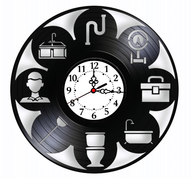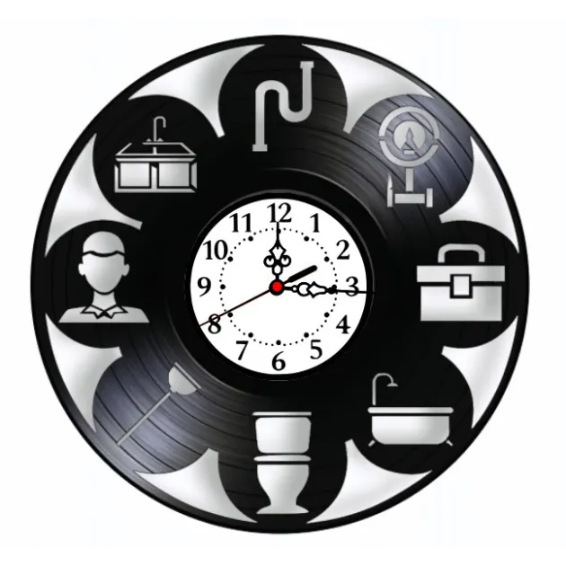 Designul ingenios încorporează simboluri reprezentative pentru domeniul instalațiilor, sculptate cu finețe și acuratețe în vinilul negru lucios. Printre elementele vizibile se numără: țevi curbate care formează o rețea elegantă în jurul cadranului, unelte specifice esențiale (chei reglabile, chei franceze, clești, și șurubelnițe de diferite tipuri), o cadă, o chiuvetă, un lavabou și alte componente necesare, precum robinete, fitinguri și chiar o reprezentare stilizată a unui contor de apă. Aceste elemente decorative nu sunt doar simple ilustrații; ele simbolizează eficiența, capacitatea rapidă de rezolvare a problemelor complexe, ingeniozitatea tehnică și rolul vital pe care îl joacă instalatorii în asigurarea confortului, igienei și funcționalității oricărei locuințe sau clădiri comerciale.