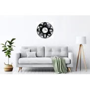 Realizat cu o atenție deosebită la detalii, acest ceas păstrează caracterul distinctiv al discului de vinil, cu suprafața sa lucioasă și textura caracteristică. Fiecare ceas este unic, fiind lucrat manual prin tehnici de decupare de înaltă precizie, ceea ce adaugă o valoare inestimabilă față de produsele standard, fabricate în serie. Acest proces artizanal garantează autenticitatea și calitatea finisajului. Utilizarea discului de vinil contribuie la o abordare sustenabilă și ecologică a decorului, oferind o nouă viață unui obiect care altfel ar fi aruncat.