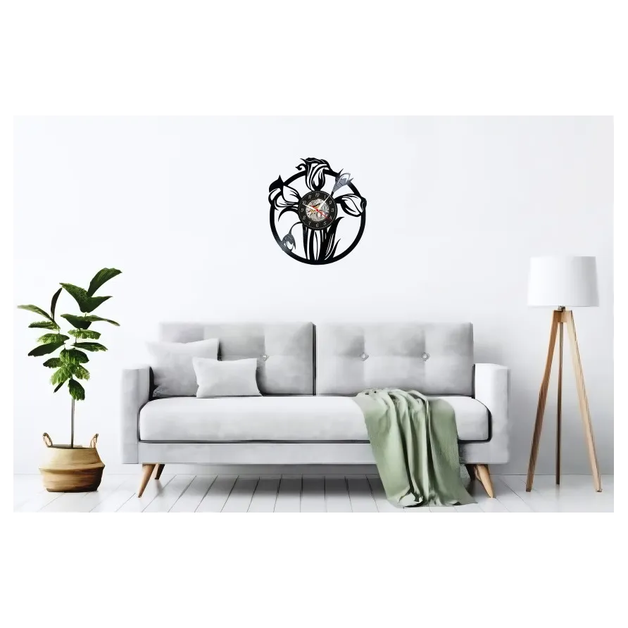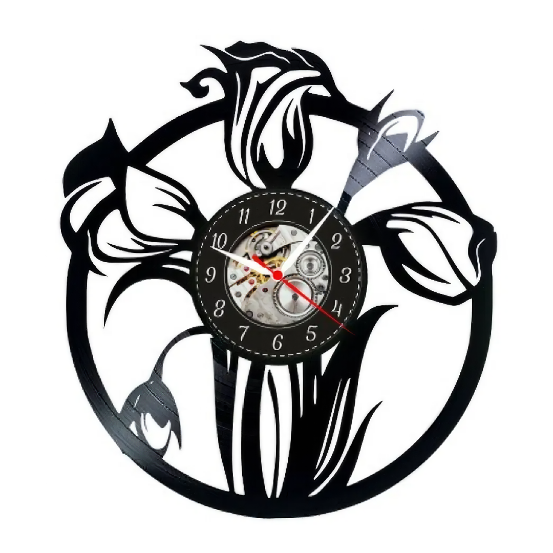 Diametru: 30 cm Material: Disc de vinil autentic Mecanism: Quartz silențios Baterie: 1 x AA (neinclusă) Design: Decupat manual cu atenție la fiecare detaliu floral Caracteristici: Motiv botanic cu lalele stilizate