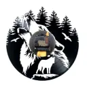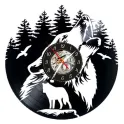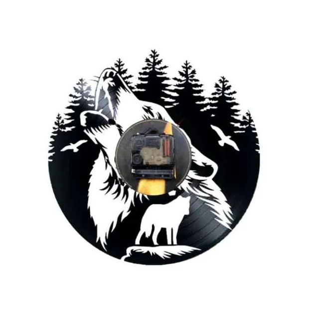 Ceas de perete cu tematică sălbatică și atmosferă de legendă nordică. Realizat din vinil decupat artistic, ilustrează doi lupi: unul în prim-plan, urlând spre cer, celălalt veghează de pe o stâncă. Fundal cu păduri, păsări în zbor și un mecanism cu rotițe vizibile – parcă inspirat de mișcarea haitei prin timp.