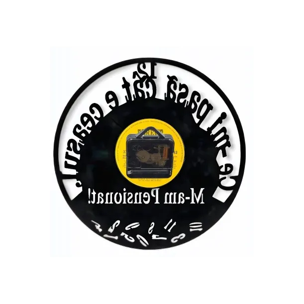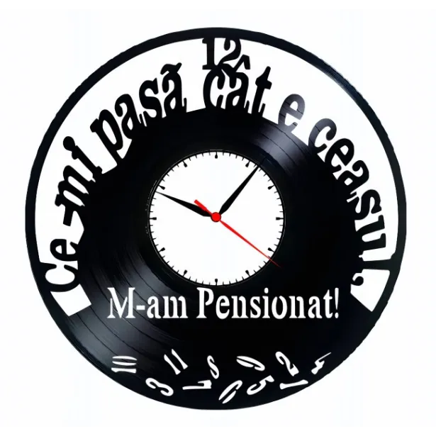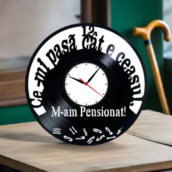Designul ingenios, decupat cu laser, transformă discul de vinil într-o capodoperă plină de umor: “Ce-mi pasă cât e ceasul?! M-am pensionat!”. Cifrele sunt răsturnate, arătând că pentru tine, timpul a devenit o noțiune relativă. Este un cadou perfect pentru un părinte, bunic sau coleg care tocmai s-a pensionat și merită să se bucure de fiecare moment fără griji.