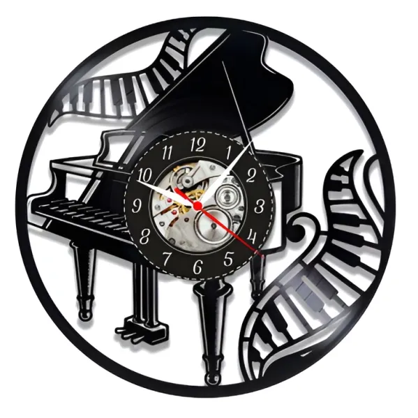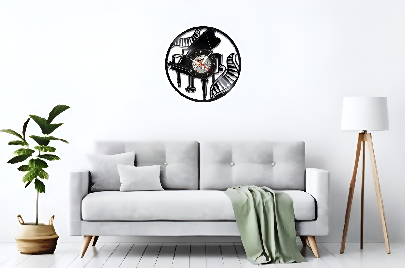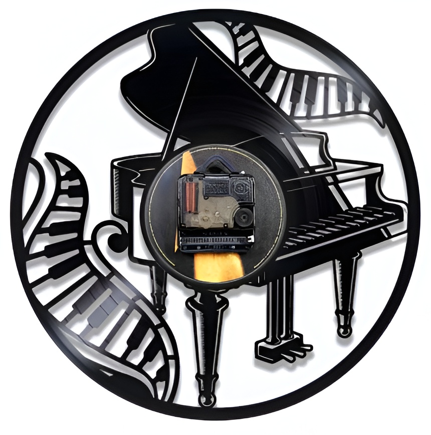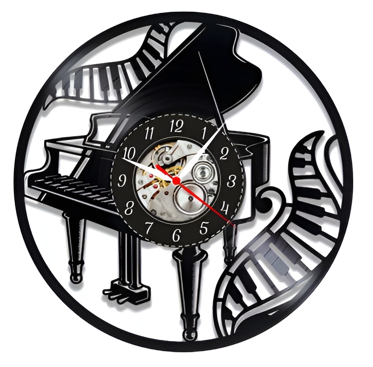 Fundalul circular al discului permite explorarea întregii compoziții artistice, în timp ce păstrează nostalgia intrinsecă a vinilului, amintind de discurile clasice ale marilor pianiști. Acest ceas este o celebrare a muzicii ca artă, ca disciplină, ca sursă de emoție și, implicit, ca o formă de exprimare atemporală. Contrastul dintre negrul lucios al materialului și umbrele proiectate pe perete adaugă o notă dramatică.