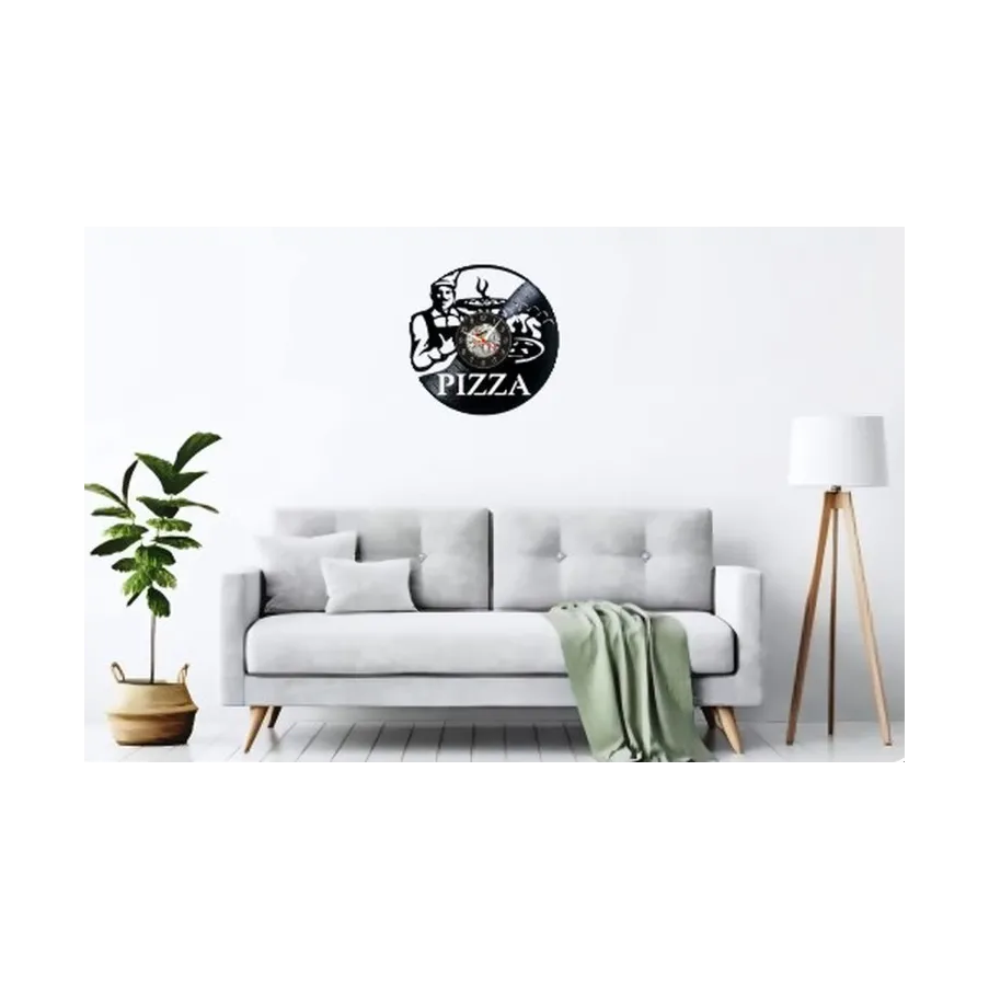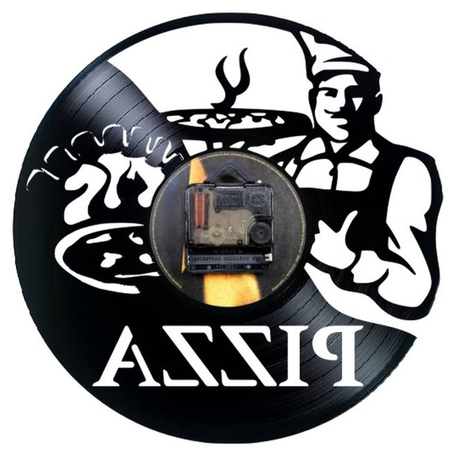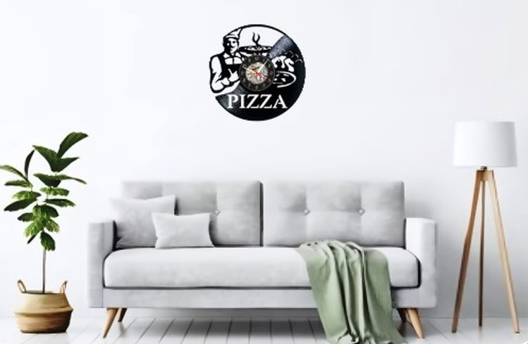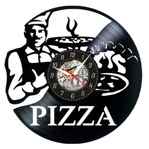 Realizat din disc de vinil original, conferind autenticitate și caracter vintage Design artistic reprezentând un bucătar cu pizza proaspăt scoasă din cuptor Dimensiune standard de 30 cm diametru, perfectă pentru orice spațiu Mecanism de ceas silențios de înaltă calitate Cifre arabe clare și ușor de citit pe fundal contrastant Finisaj negru mat cu detalii precise tăiate laser