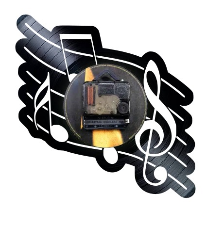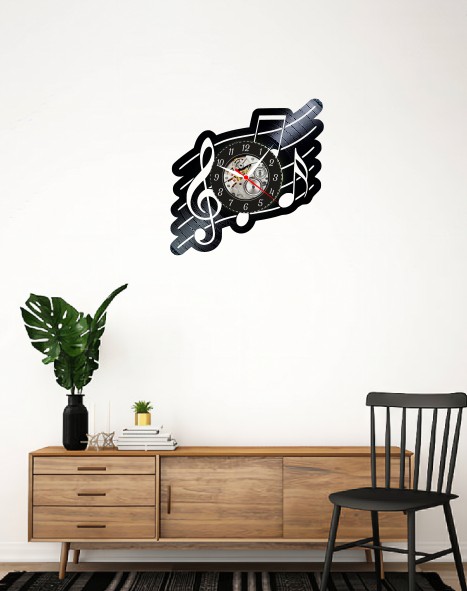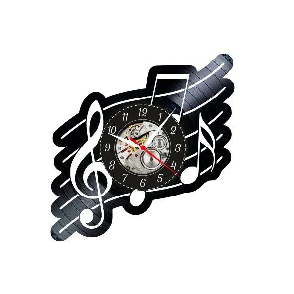 **Elemente Artistice:** – Confecționat manual din disc de vinil LP original – Cheie de sol sculptată cu linii fluide și naturale – Portativ diagonal cu linii perfecte pentru note muzicale – Note muzicale diverse (întregi, doimi, pătrimi) pentru ritm vizual – Cadran central cu mecanism aparent, stil vintage-muzical – Acul roșu vibrant simbolizând pasiunea muzicală – Dimensiuni: ~30cm diametru