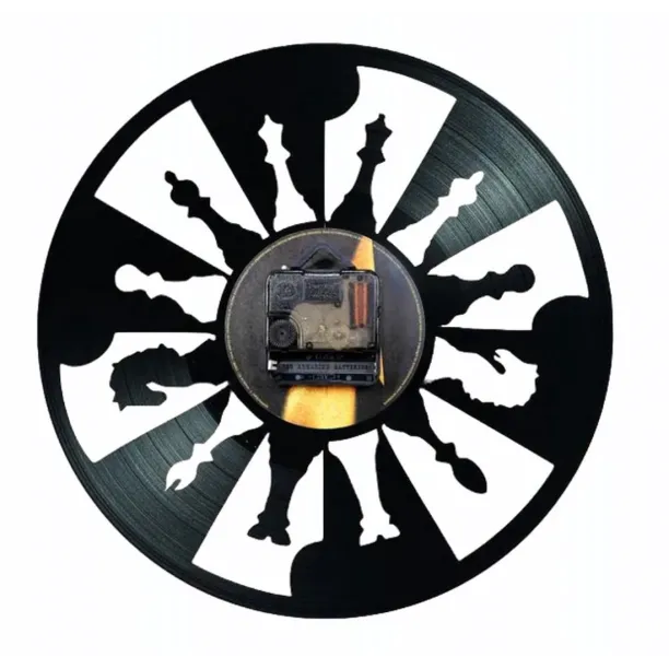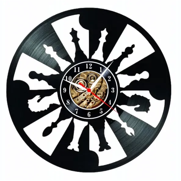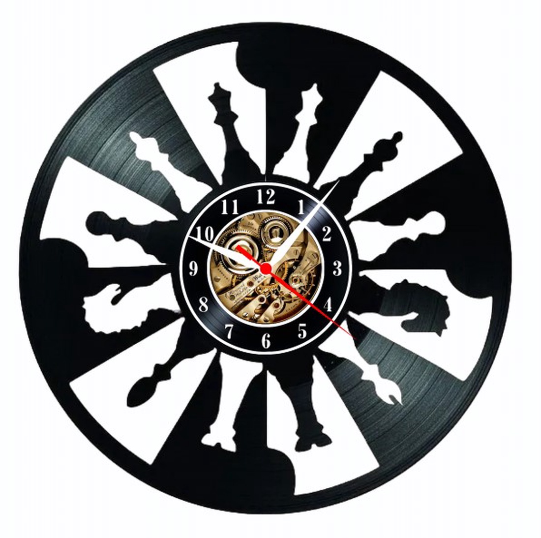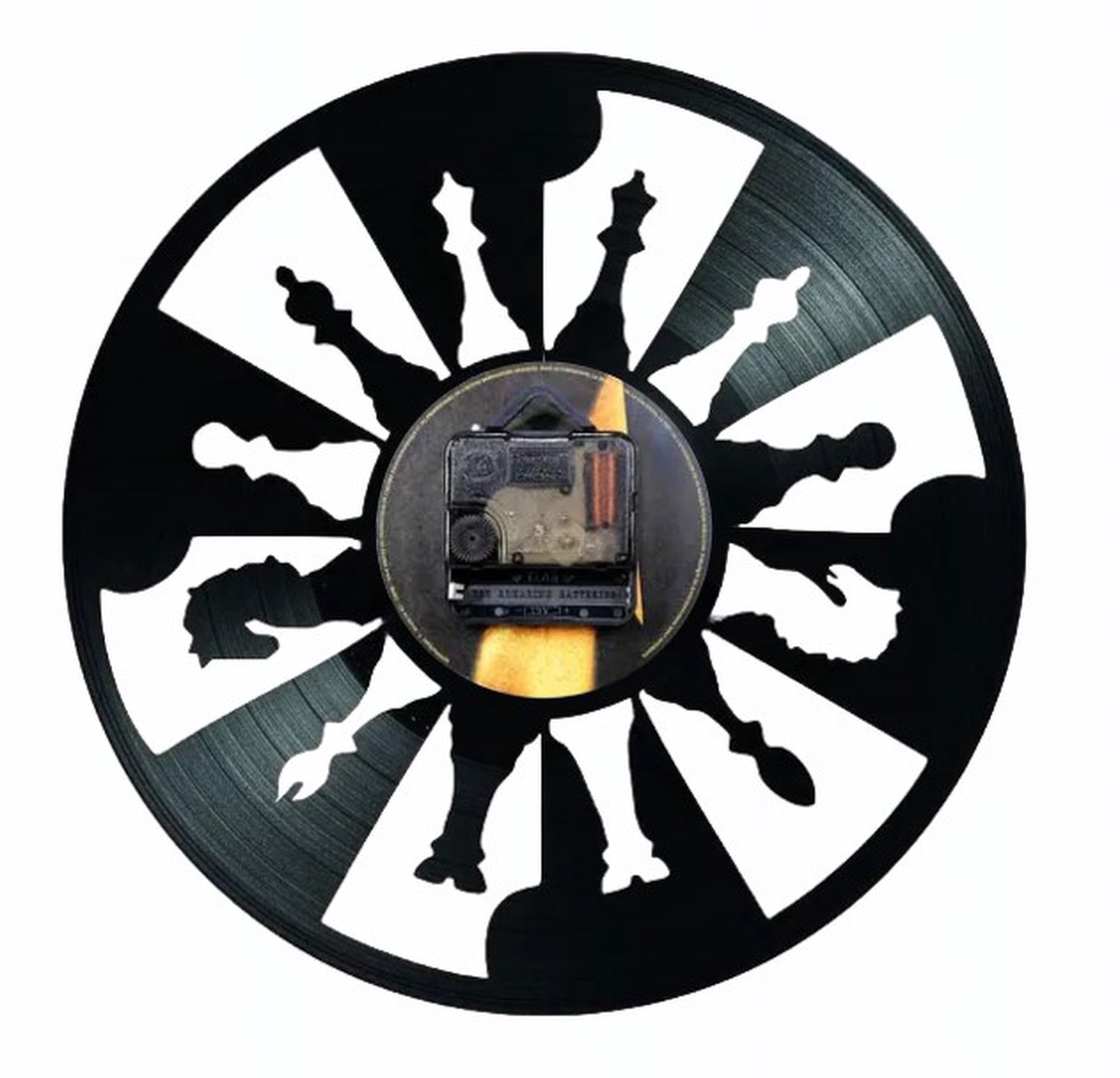 Prezentăm un ceas tematic de șah realizat cu atenție dintr-un disc de vinil, lucrare manuală ce aduce un aer retro și vintage în decorul său.