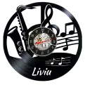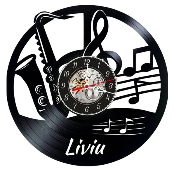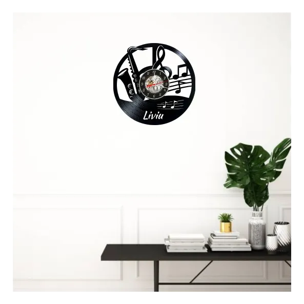 Această operă de artă elegantă și rafinată celebrează frumusețea, improvizația și libertatea muzicii jazz cu un design sofisticat, ce prezintă saxofonul și notele muzicale. Piesa este sculptată manual dintr-un disc de vinil autentic (LP), transformat într-un tribut vizual adus muzicii mari. Ceasul „Saxophone Liviu” este mai mult decât un simplu cronometru; este o declarație de stil, un omagiu personal și un element de decor care aduce în spațiul tău atmosfera intimă și sonoritățile calde ale unui club de jazz.