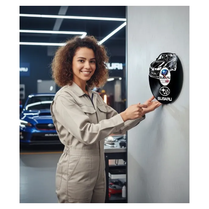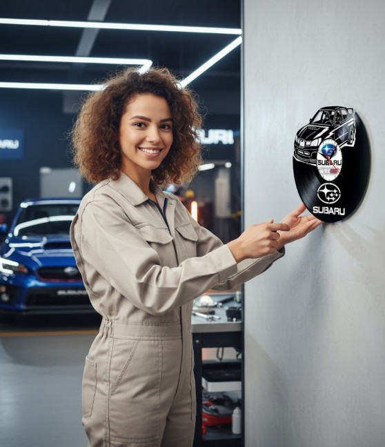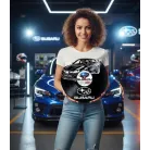 În centrul compoziției se află un cadran elegant care încorporează logo-ul oficial Subaru, cu emblematica stea albastră din constelația Pleiadelor și sigla WRX STI, simboluri recunoscute instantaneu de către entuziaștii mărcii. În partea inferioară a ceasului, logo-ul Subaru este redat la dimensiuni mai mari, completând perfect tema generală. Realizat manual cu o atenție deosebită la detalii tehnice și estetice, acest ceas reprezintă mult mai mult decât un instrument pentru măsurarea timpului - este o declarație de pasiune pentru ingineria japoneză și performanța auto. Perfect pentru garaje, ateliere mecanice, birouri sau orice spațiu care reflectă dragostea pentru mașinile sport.