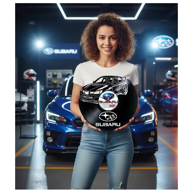 Vă prezentăm o creație artistică excepțională pentru pasionații auto și fanii Subaru: ceasul de perete Subaru WRX STI, sculptat cu precizie dintr-un disc de vinil autentic.