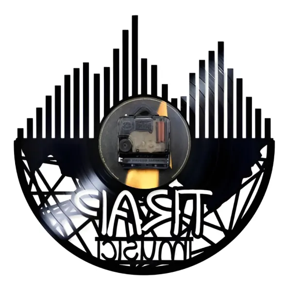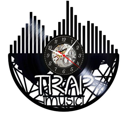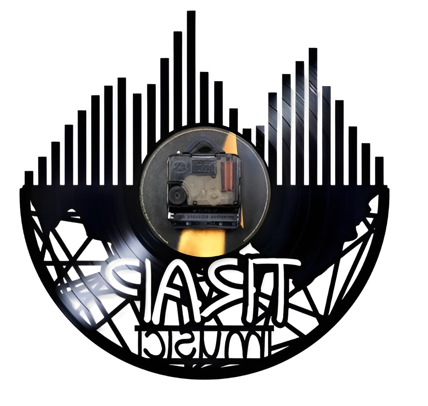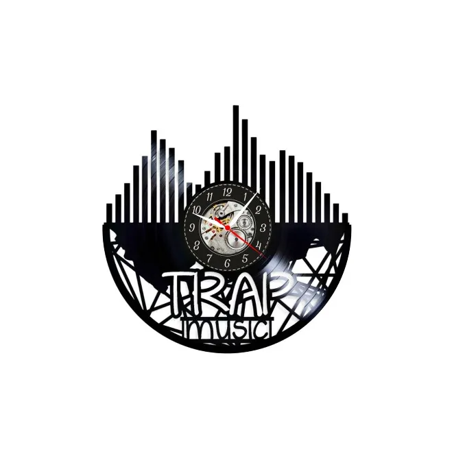 **Caracteristici Artistice:** – Confecționat manual din disc de vinil LP original – Equalizor audio sculptat cu bare de înălțimi diferite pentru efect dinamic – Typography bold “TRAP MUSIC” integrată organic în design – Cadran central cu mecanism aparent, stil industrial-urban – Acul roșu vibrant pentru contrast maxim și attitude rebel – Dimensiuni: ~30cm diametru