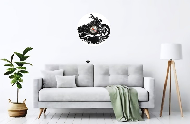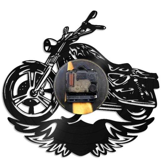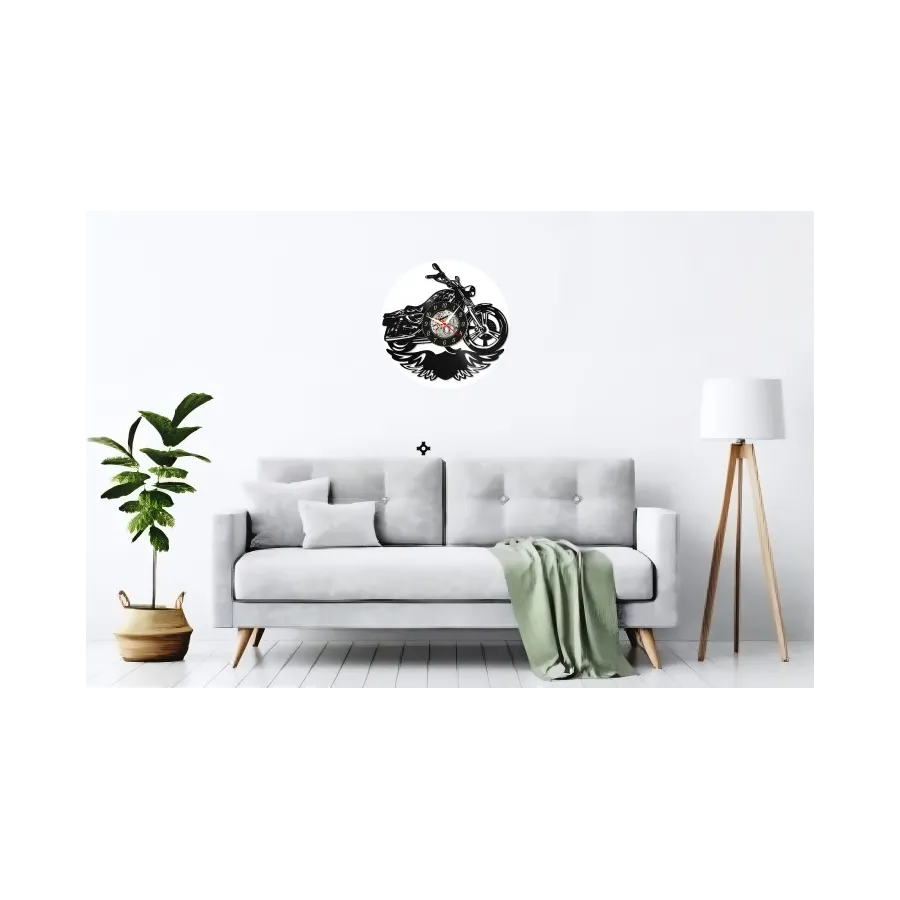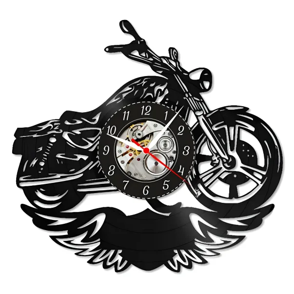 Realizat manual din disc de vinil original prin tăiere laser de înaltă precizie Design complex cu motocicletă chopper în stil american clasic Aripi spectaculoase integrate care conferă dinamism și mișcare Detalii minuțioase: roți cu spite, ghidon înalt, motor vizibil, rezervor Dimensiune generoas de 30 cm, impact vizual maxim Mecanism de ceas silențios cu cifre arabe contrastante Finisaj negru intens cu textură vintage a vinilului