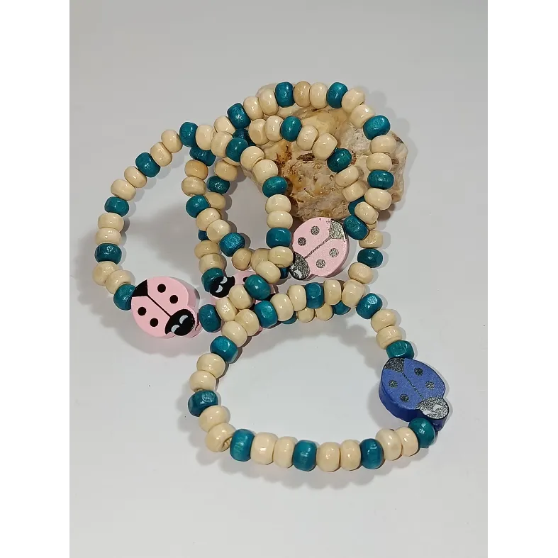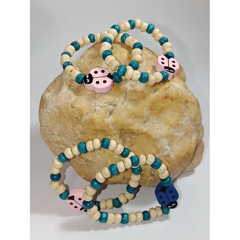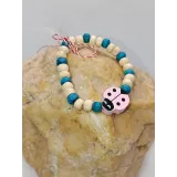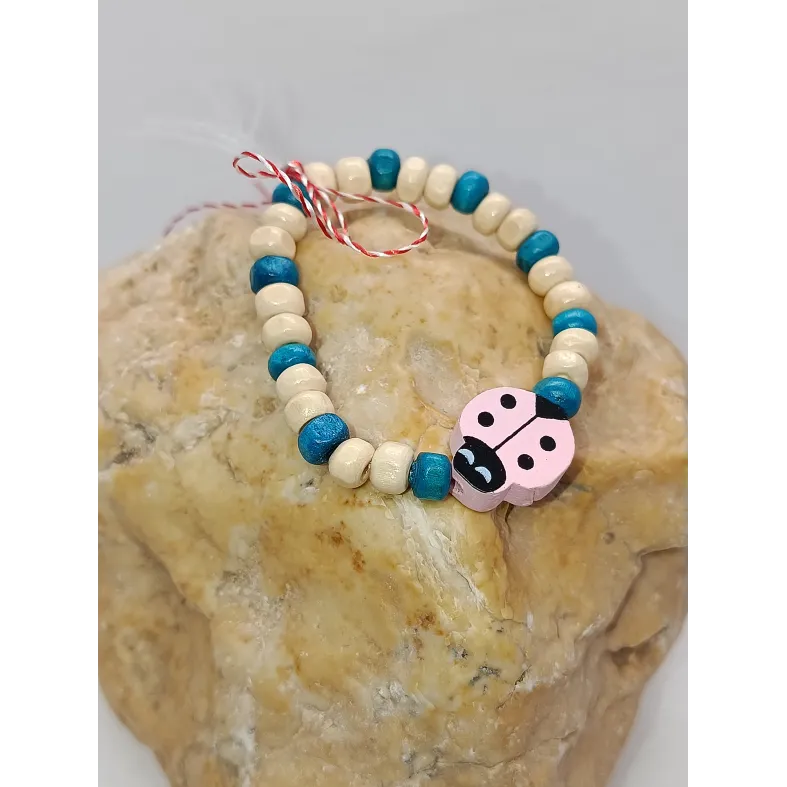 Piesa centrală este un charm gărgăriță din lemn, disponibil în variante cromatice de roz delicat sau albastru intens, simbolizând norocul și renașterea naturii. Cu o dimensiune adaptabilă de 12-14 cm, brățara este montată pe un fir elastic durabil, fiind extrem de ușor de purtat și rezistentă la micile aventuri zilnice ale copiilor. Este alegerea perfectă pentru un mărțișor handmade care îmbină materialele naturale cu un design modern și jucăuș.
