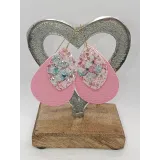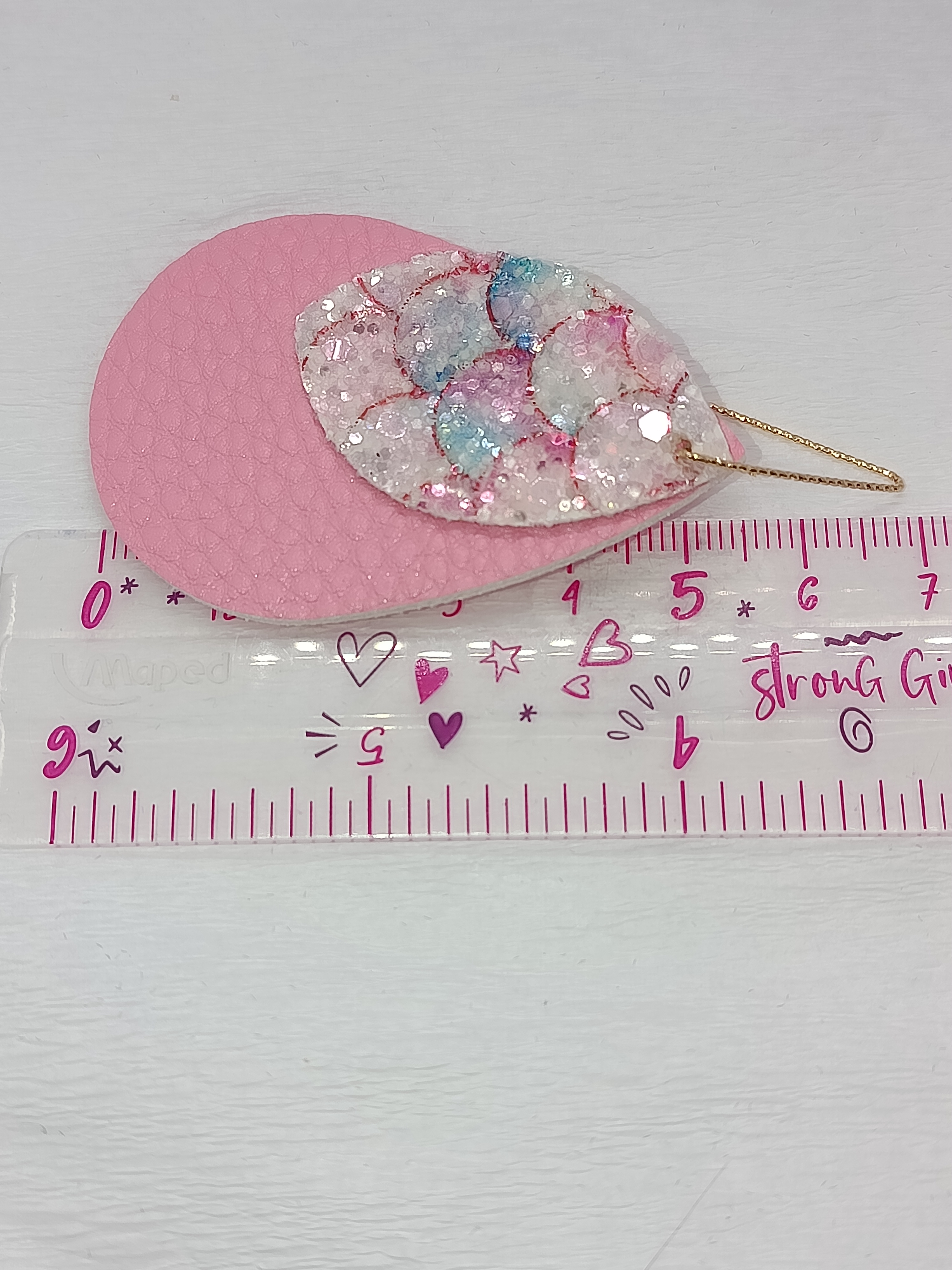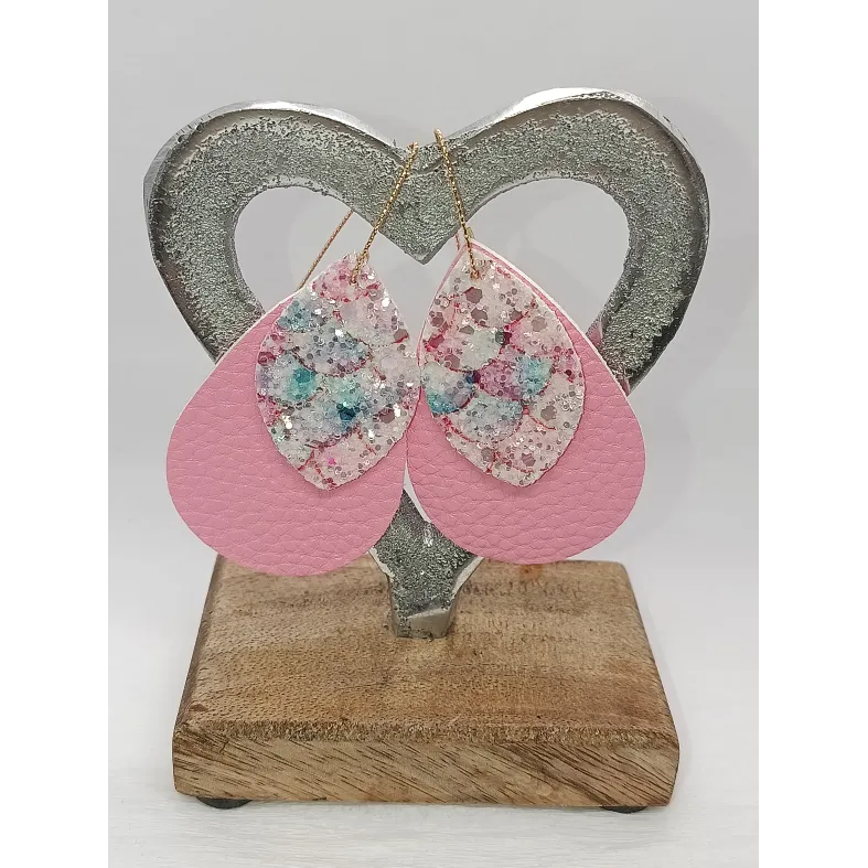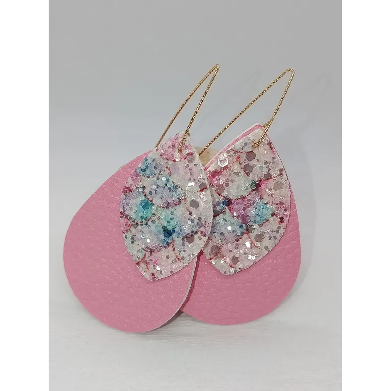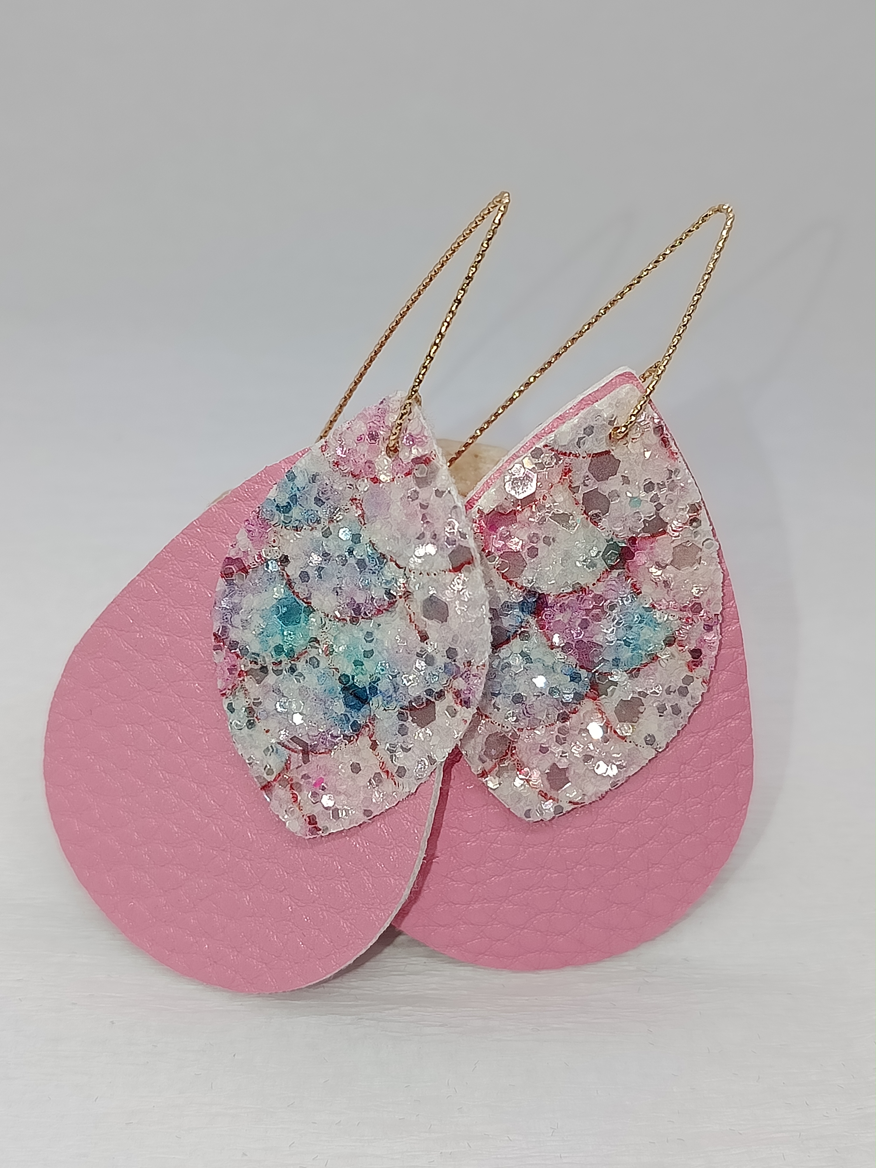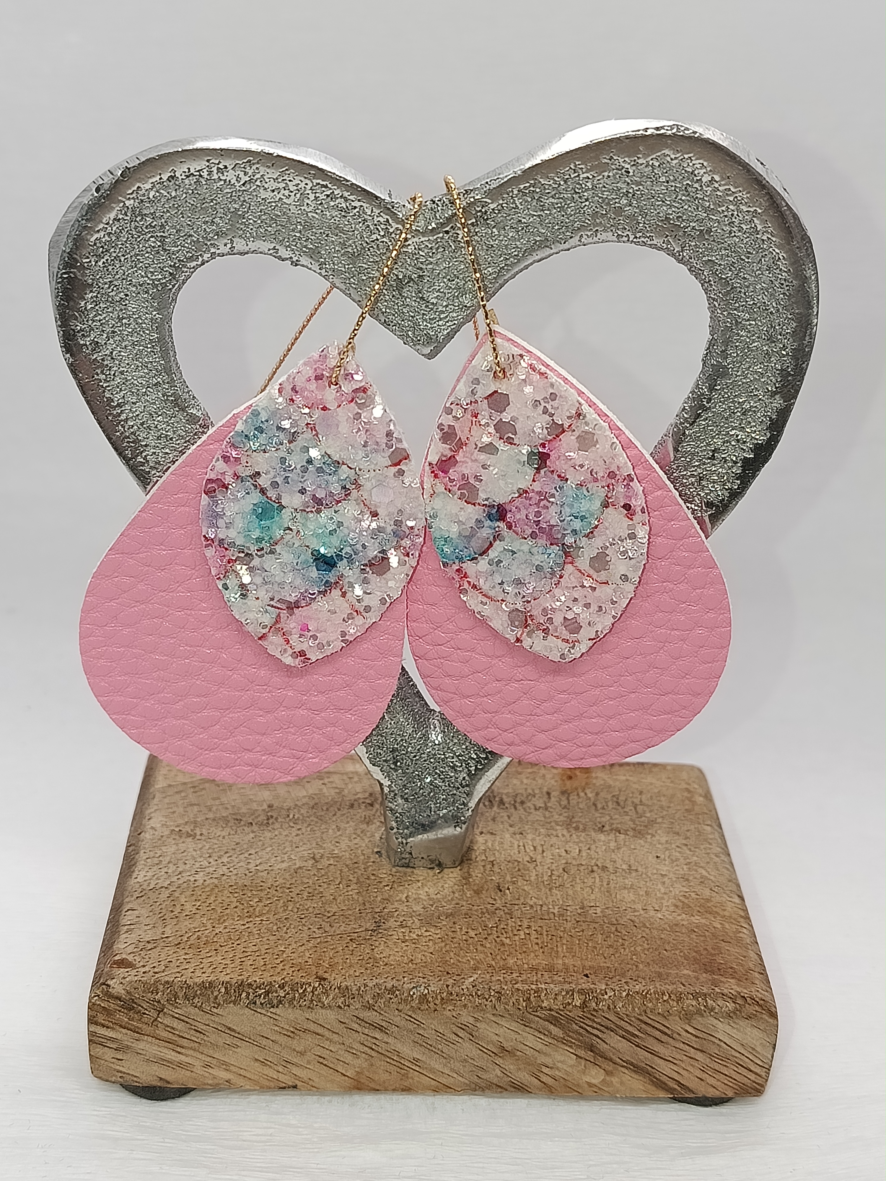 Acești cercei de 7 cm sunt realizați prin suprapunerea a două straturi de piele: o bază roz intens cu textură fină și un strat superior în formă de frunză, decorat cu sclipici multicolor ce amintește de reflexiile mării. Combinația oferă un volum tridimensional spectaculos, rămânând în același timp extrem de ușori și confortabili.