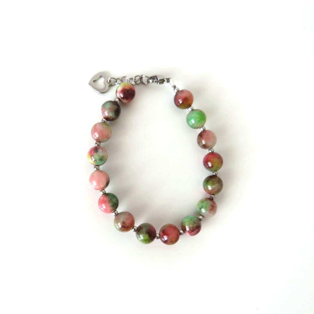 Bratara realizata din sfere de Agat verde cu grena, Bilute din inox si un Charm inimioara din inox.Lungime bratara: de la 18 la 19 cm. Are un mic lant prelungitor din inox.