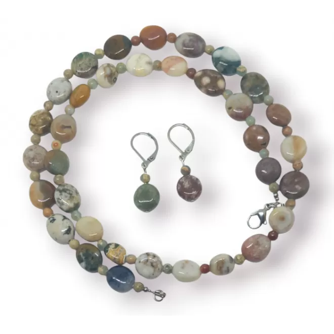 Setul(Colier+Cercei) este realizat din pietre semipretioase de Agat indian si pietre mici din Serpentin. Lungime Colier: 55 cm.Accesoriile si tortitele cerceilor sunt din inox.