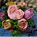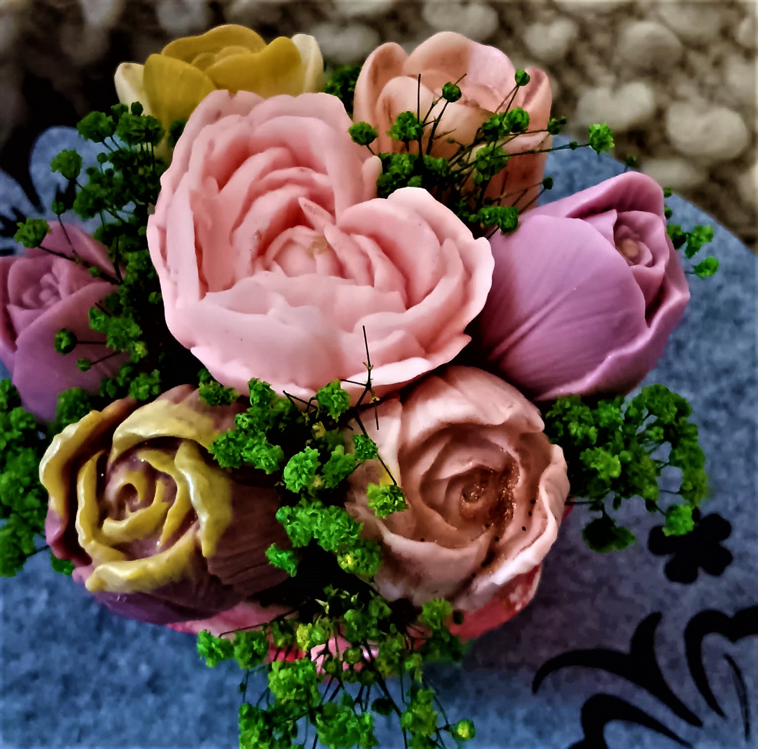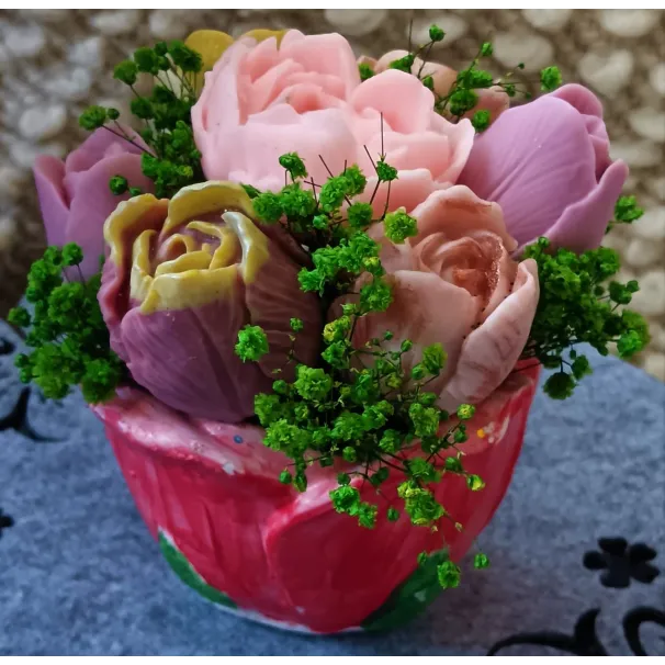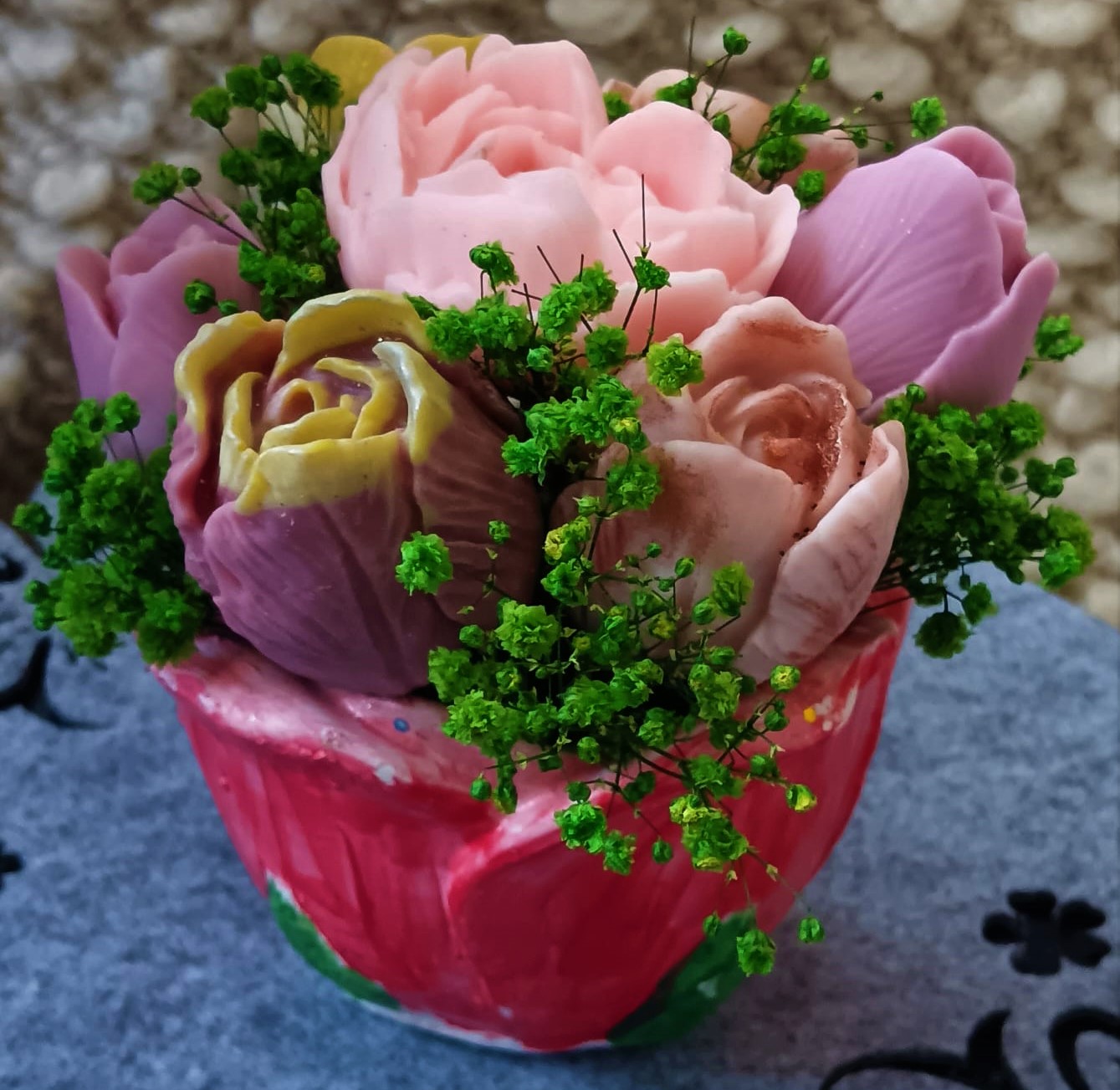 Aranjament floral handmade realizat din flori turnate manual din ceară naturală, în nuanțe delicate de roz, mov lila și galben. Acestea sunt așezate cu grijă într-un vas ceramic deosebit, turnat și pictat manual în formă de trandafir. Îmbinarea cromatică luminoasă și suportul artistic transformă aranjamentul într-o piesă de decor elegantă, plină de rafinament și originalitate.