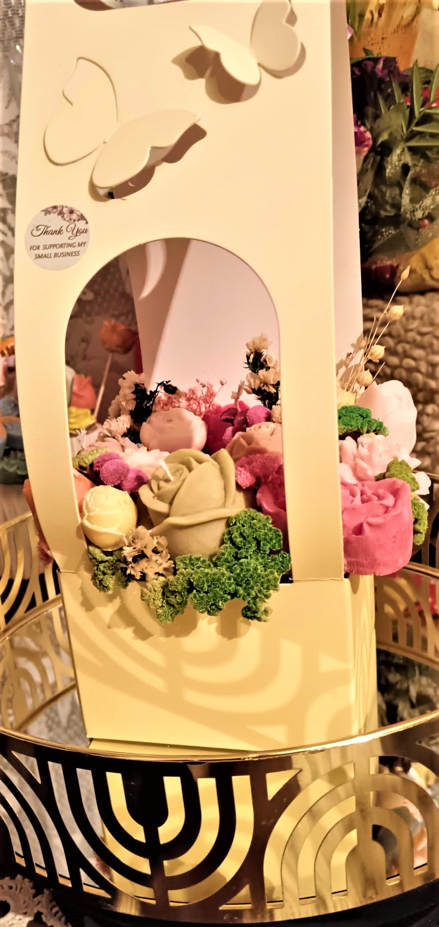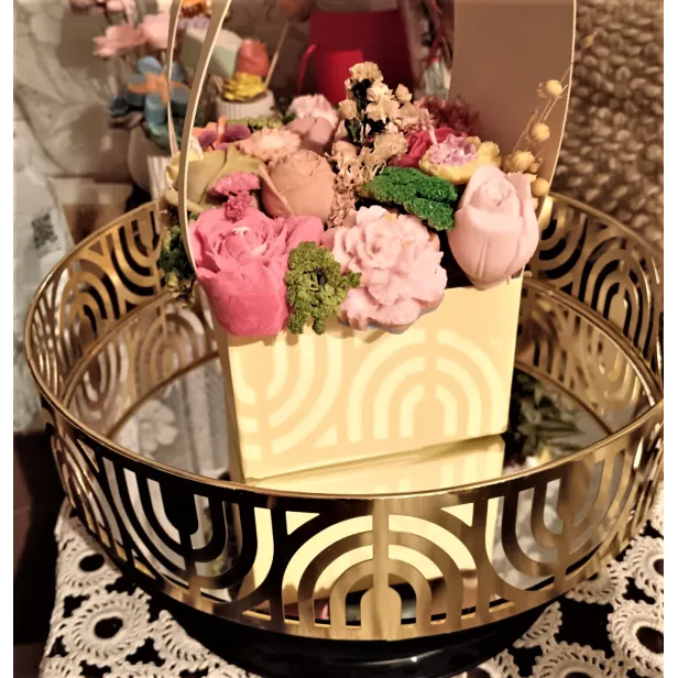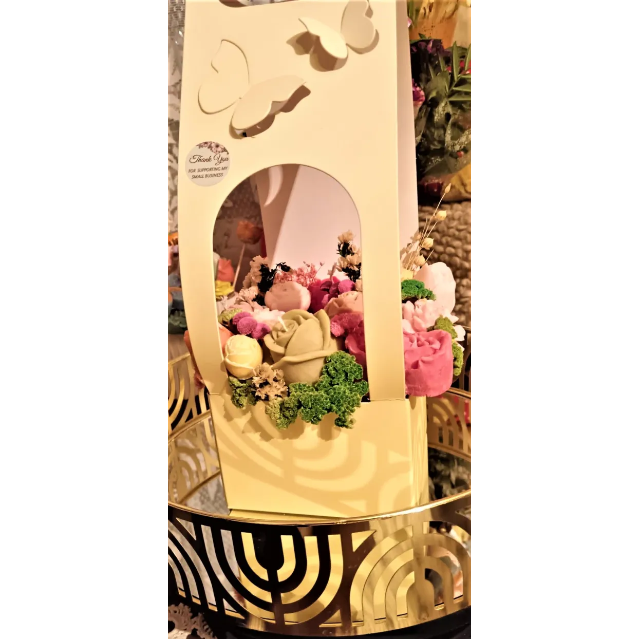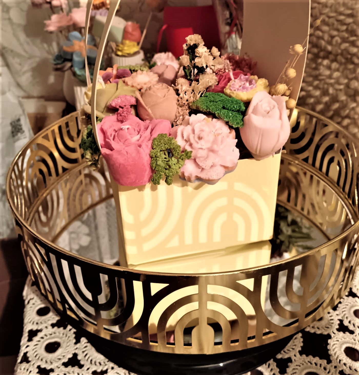 Un buchet care nu se ofilește niciodată. Acest aranjament handmade, creat din flori de ceară naturală minuțios turnate, aduce un strop de eleganță și căldură în orice spațiu. Fiecare petală este lucrată cu grijă, îmbinând tonuri delicate de roz, galben, lila și alb, pentru a crea o compoziție plină de armonie.