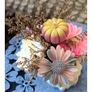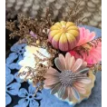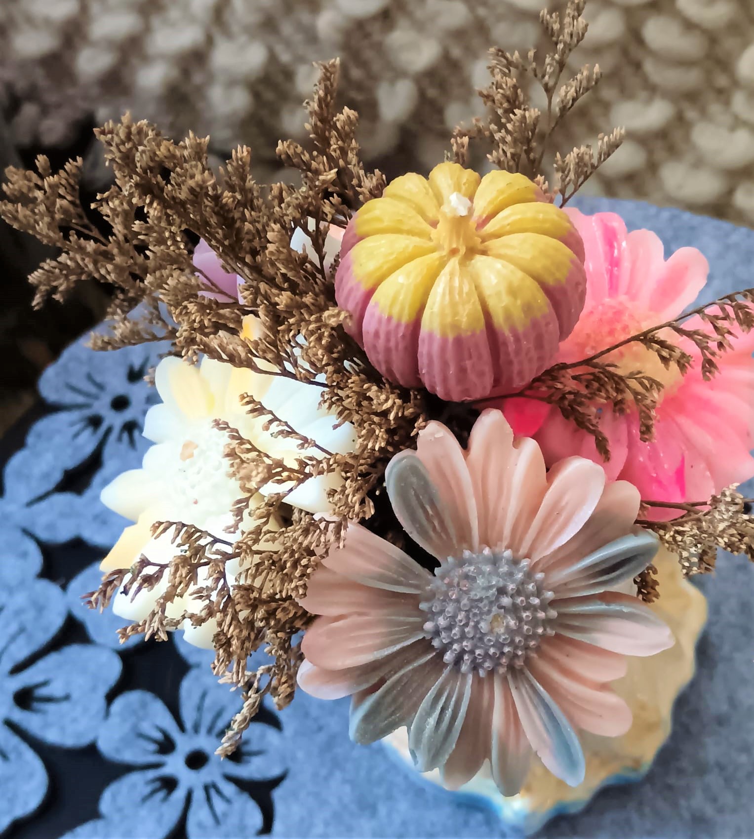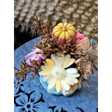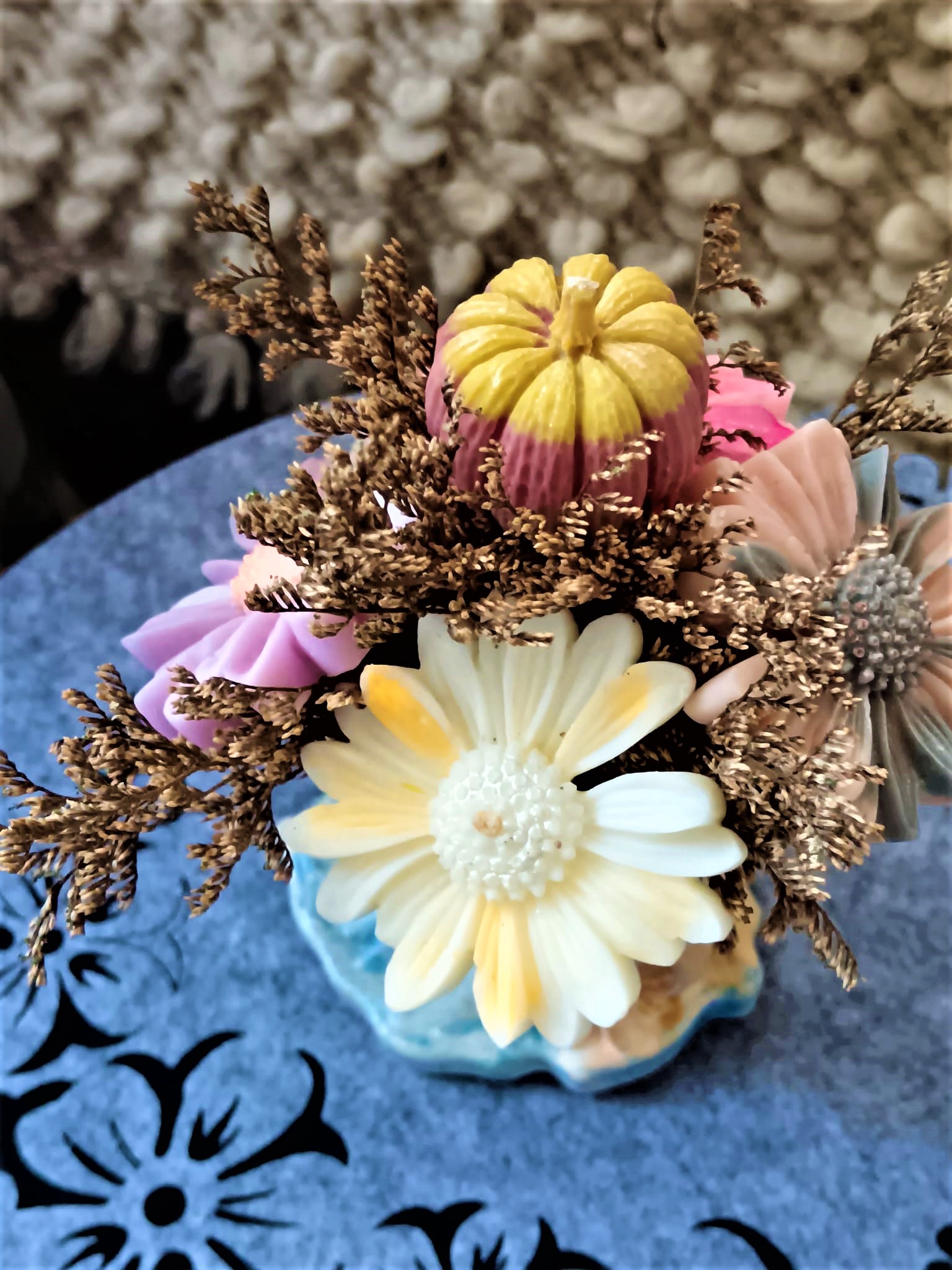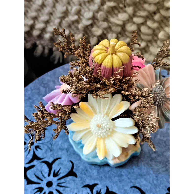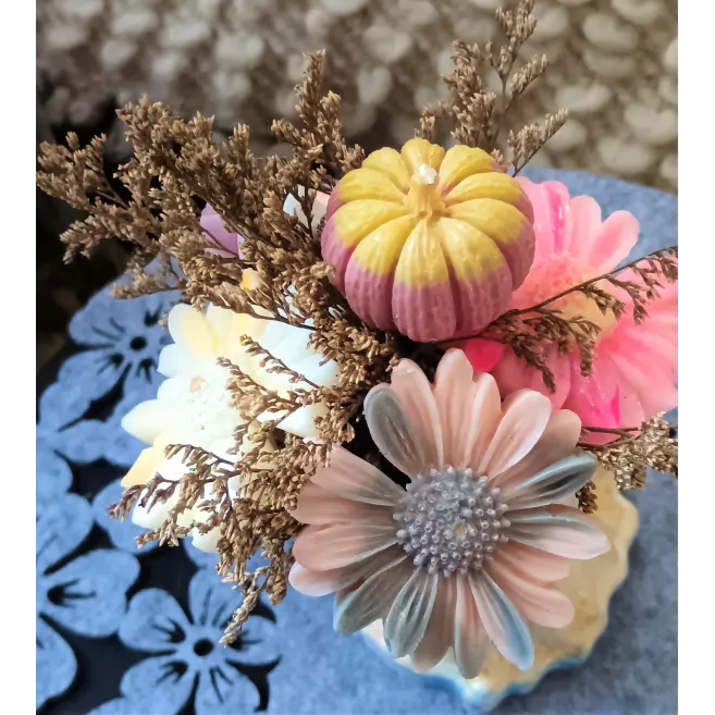 Aranjament floral handmade realizat din flori turnate manual din ceară naturală, în nuanțe calde tomnatice, dispuse într-un vas ceramic realizat manual. Detaliul surpriză – un mic dovleac decorativ așezat în vârf – aduce un aer autentic de toamnă și transformă aranjamentul într-o piesă de decor plină de farmec și originalitate.Ideal pentru: decor de sezon, cadouri speciale, aducerea atmosferei de toamnă în casă sau la birou.